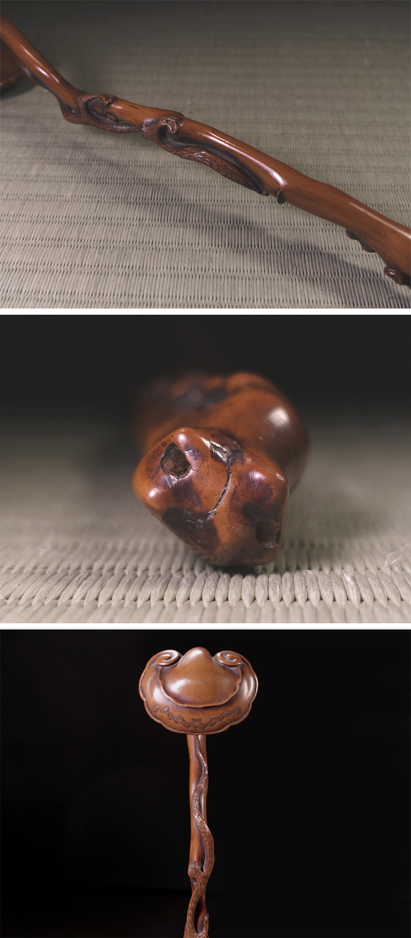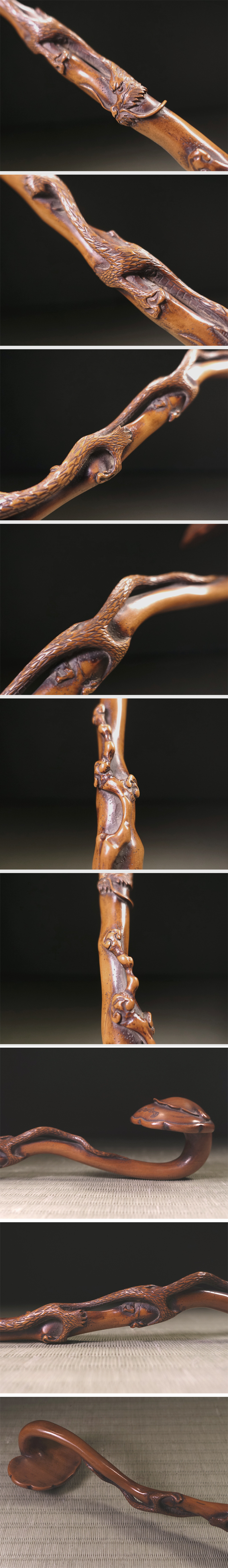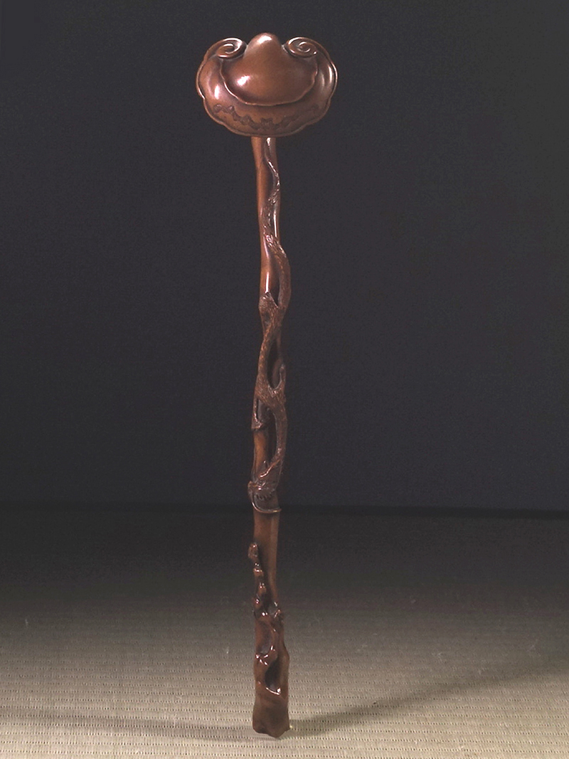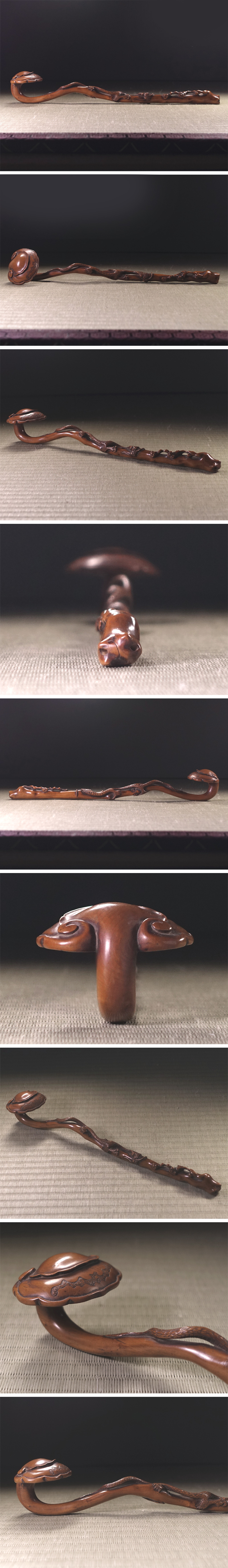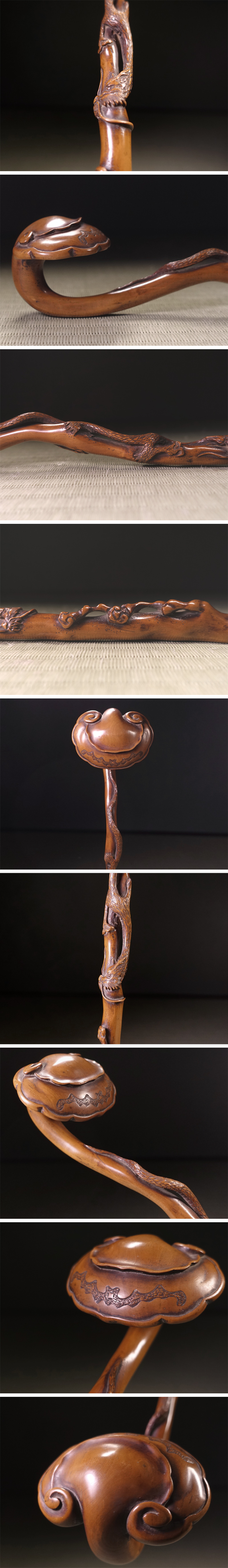 ∇花∇中国古玩 黄楊木雕靈芝如意 黄楊木霊芝纏龍如意 35.5cm 法具法器仏教工芸 收藏
