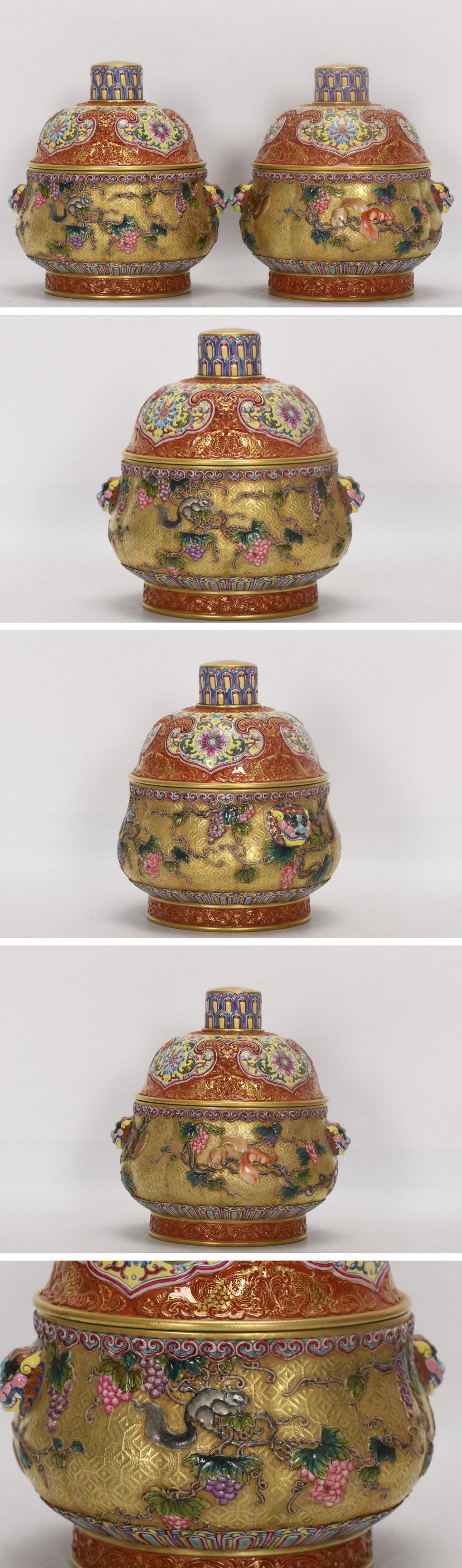 【清】関西某オークション購入 中国・清時代 琺瑯彩松鼠紋双耳蓋爐 極細工 古置物 古擺件 中国古美術7L12-US1 收藏