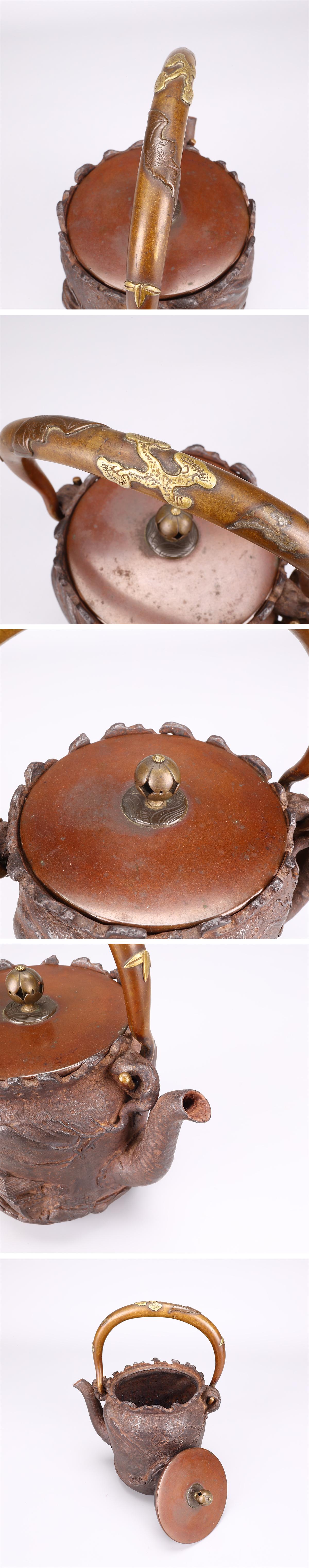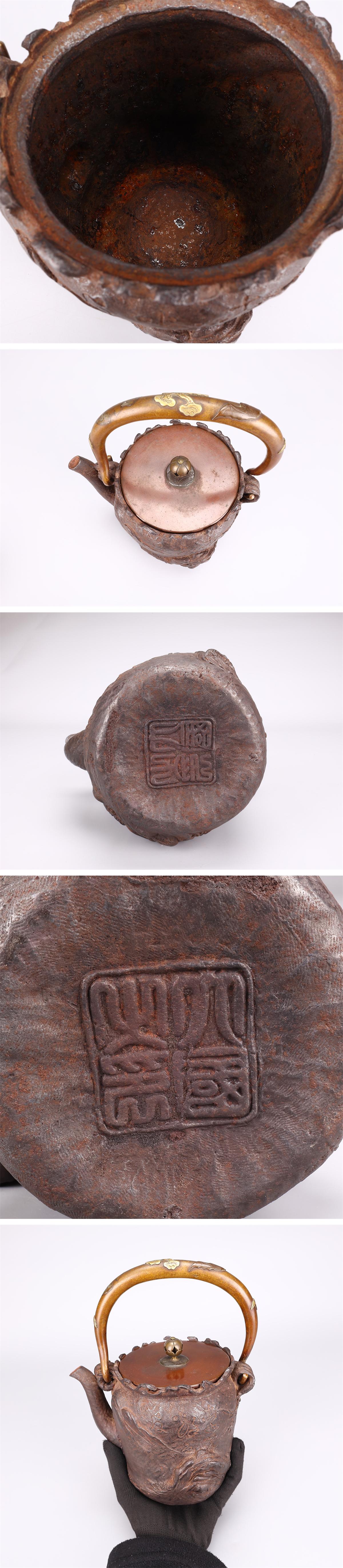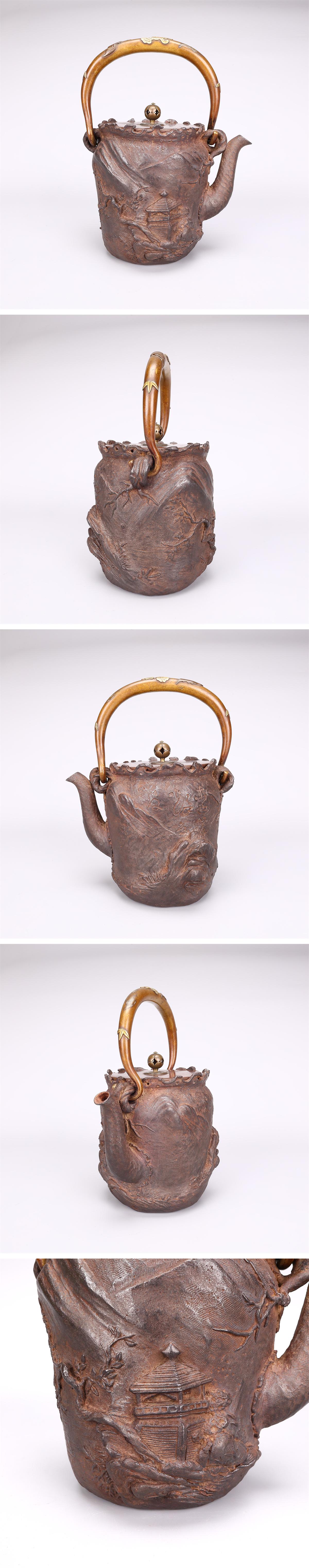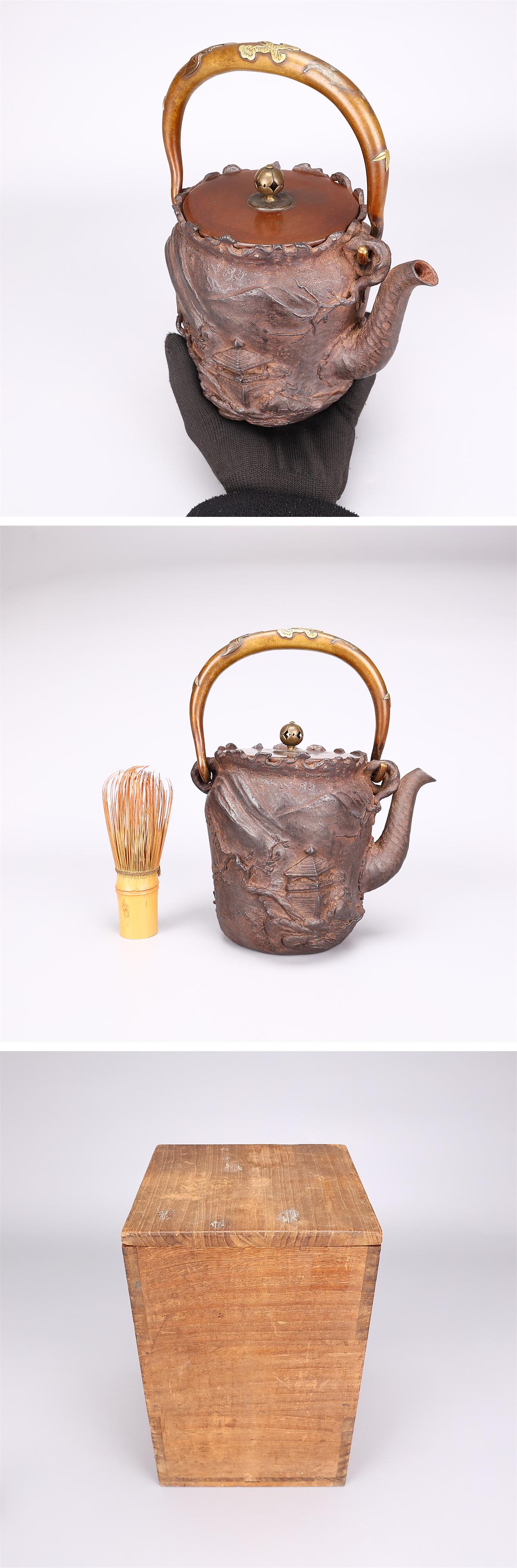 【吉】TA822 江戸時代 【大国寿朗】造 山水漢詩文 小振 鉄瓶/箱付 水漏れ無し 本物保証TZ! 收藏