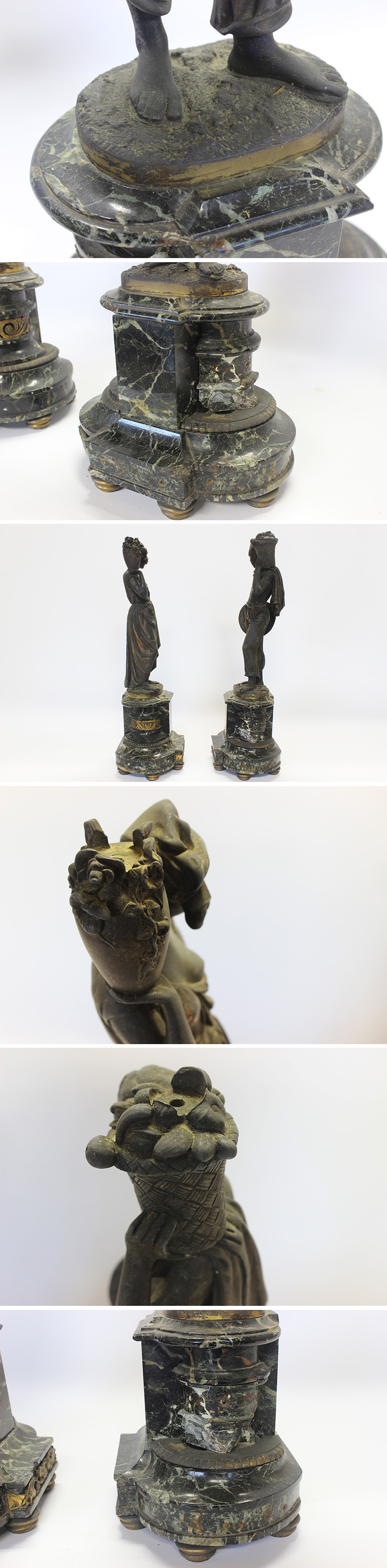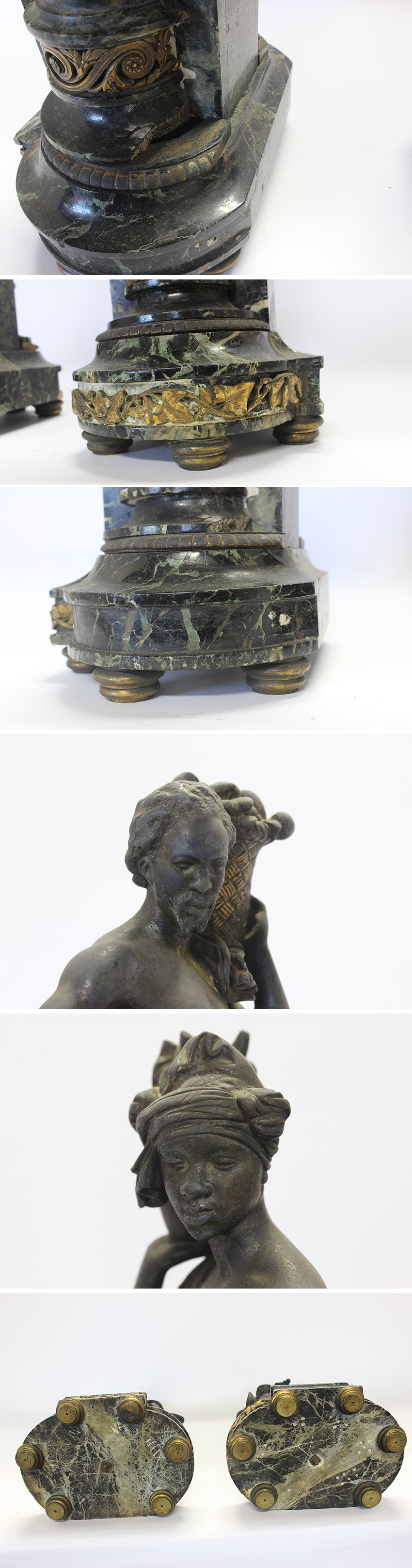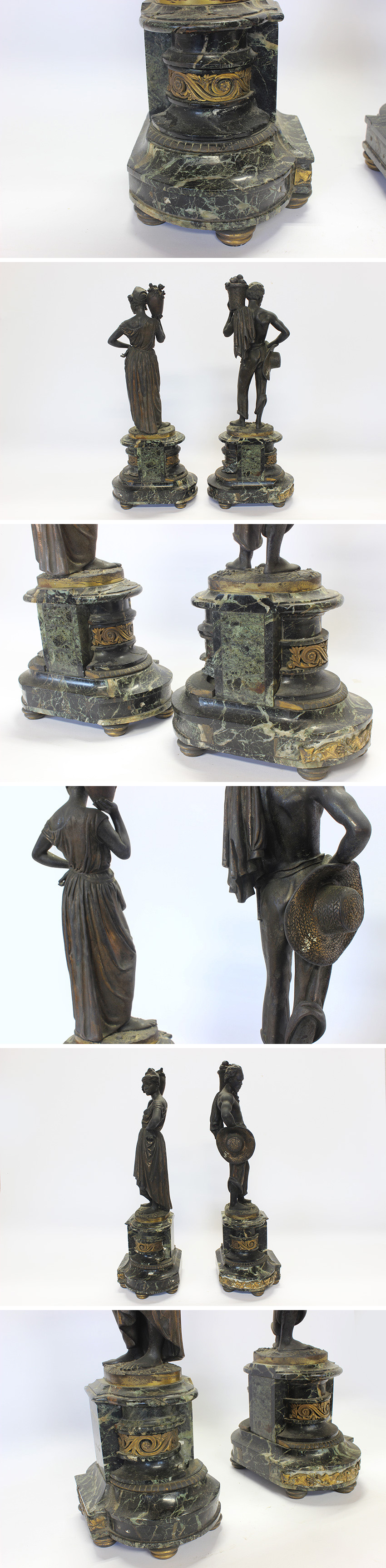 * サイズ(約)・・・高さ:500 横幅:200 奥行:140 ㎜ (台座含む) *重量(約)・・・各 10 ㎏ *注意点 ・大理石に破損して無くなった部分や、彫刻の外れた場所がございます。 ・大理石や接合部に緩い場所があり、手で押すと多少ふらつきます。 (倒れることはございません) ・上記の事などがございますので、寝かせた状態の2個口で発送を予定しております。 (下記参考程度に参照下さいませ。正確な詳細は不明です) ・主題: 左側の女性像は頭に水差しを、右側の男性像はバスケット(または類似の容器)を運んでおり、これらはジャック=アンリ・ベルナルダン・ド・サン=ピエールによる有名な小説『ポールとヴィルジニー』(1788年)の登場人物を表しています。彼らはインド洋の植民地における無垢な愛の象徴として描かれています。 ・素材: この像はブロンズ製で、黒大理石(ブラックマーブル)の台座に取り付けられています。 作者: シャルル・カンバーワースはイギリス人士官の息子としてフランスで生まれ、パリ国立高等美術学校でジェームス・プラディエに師事しました。彼は1833年から1848年までサロンに出品し、主に古典的な女性像で知られています。 詳細は掲載写真をご参考下さい。 ご理解いただける方のみご入札をお願いいたします。 ※寸法に若干の誤差が生じる場合もございます。目安としてご参考下さい。 ※画像につきましては、PC環境により実物と色合い等、若干異なる場合がございますので、予めご了承ください。 |