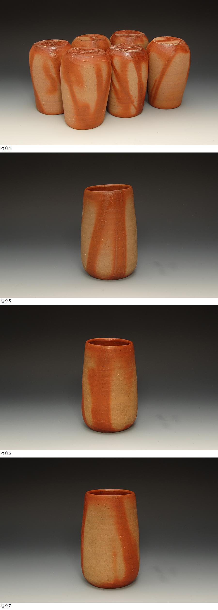 作品の少ない火襷のビールカップ6客揃いです独特の造形と優雅な火襷の景色の楽しめる完璧な上がりの作品です。