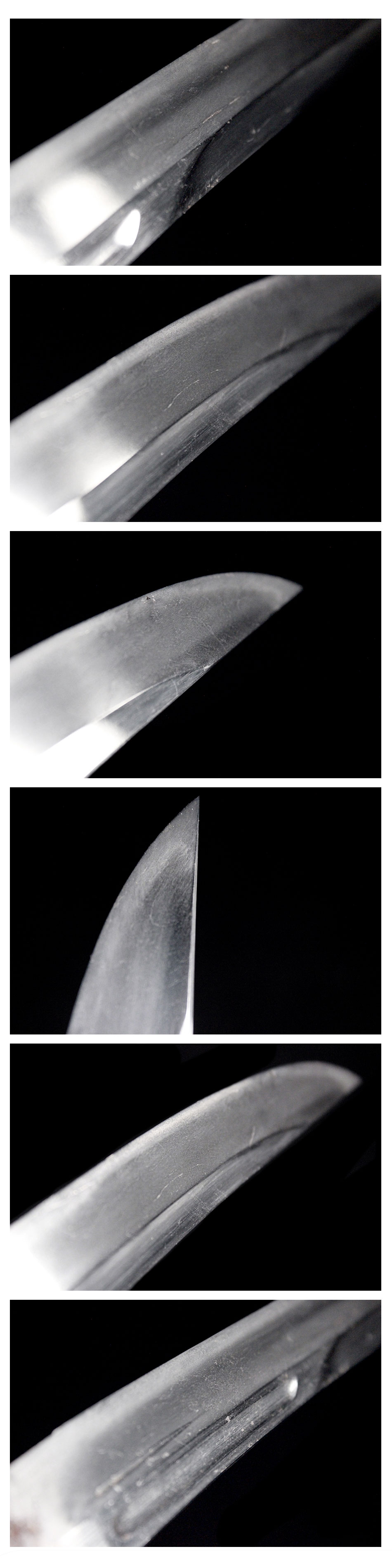 刀身長:8寸6分1(約26cm) 反り:1分5厘(約0.4cm) 目くぎ穴:2個 元幅:約27.4mm 元重:約5.7mm 先幅:約21.6mm 先重:約5.4mm 刀身重:約223g 棟:庵棟 ハバキ:銅 |