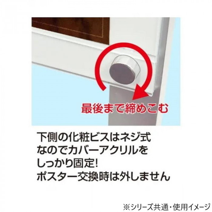 | 仕様 | 本体フレーム:アルミ押出し フレーム・化粧ビス:アルマイト仕上 面板:下辺アンダーバー付 屋内・屋外可(ポスターに耐水加工が必要) ポスターサイズ:W728×H1030mm |