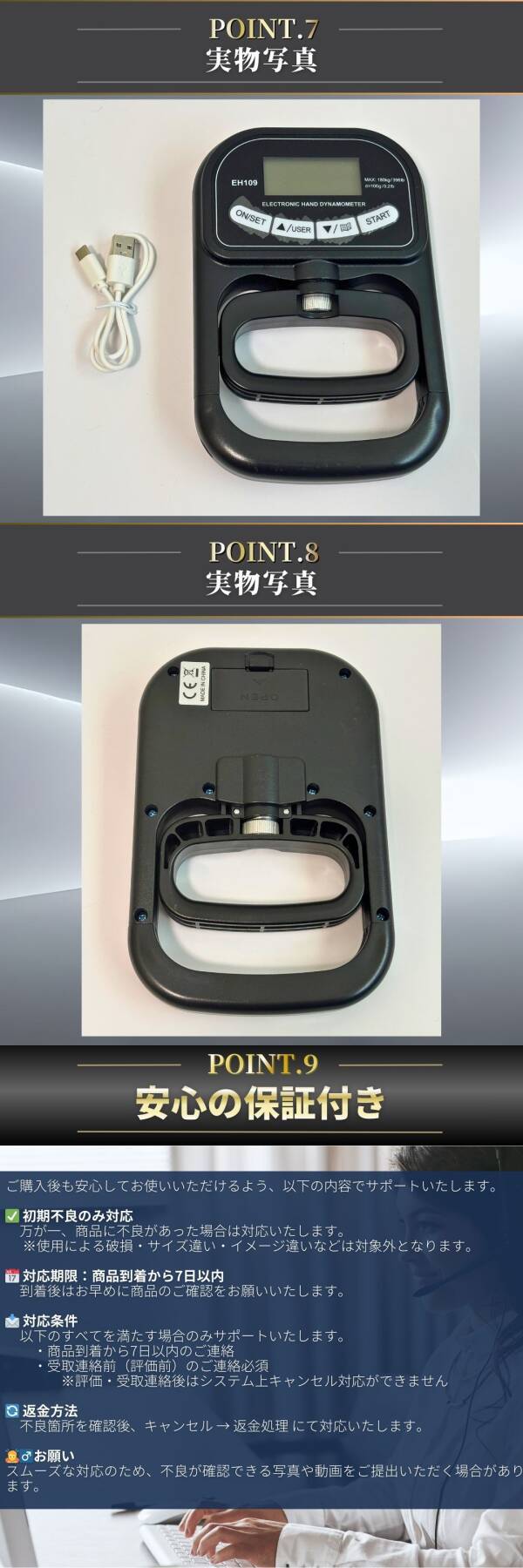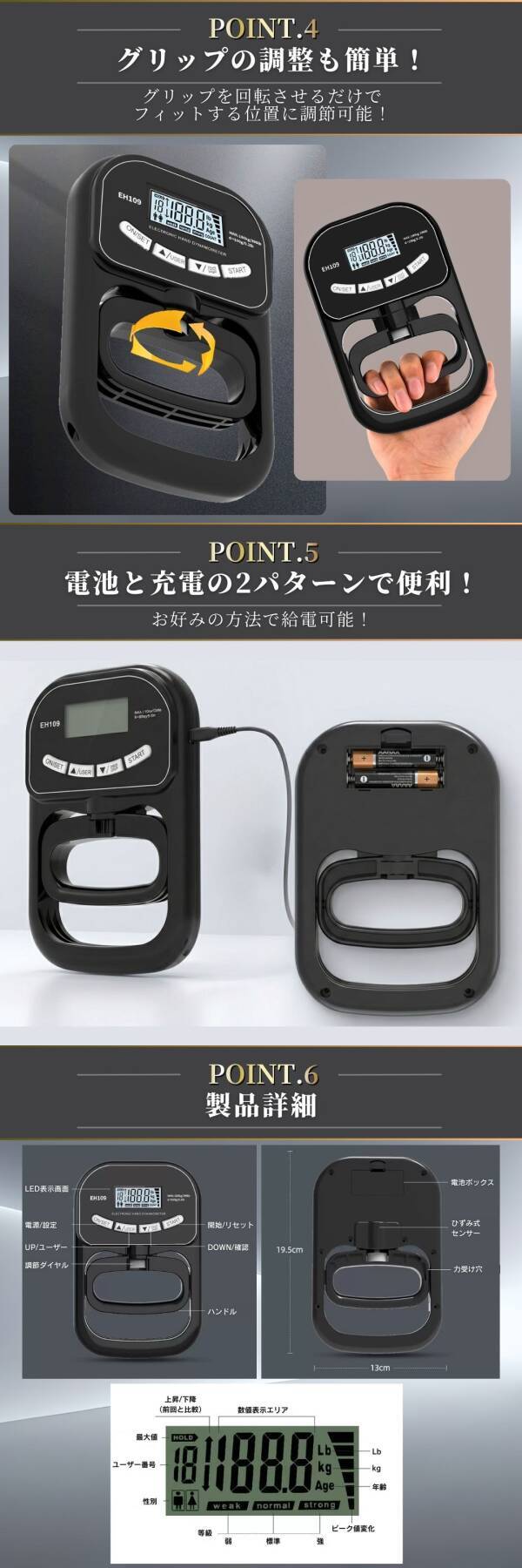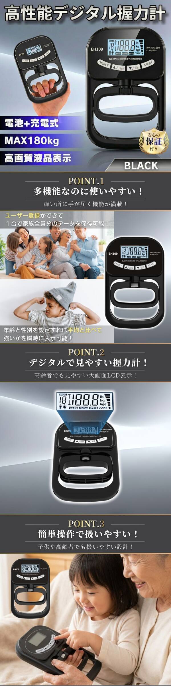 2026年最新モデル「EH109」デジタル握力計です。 従来モデル(最大120kg)から進化し、最大180kgまで計測可能。USB-C充電に対応し、単4乾電池(2本、別売り)でも使用できる便利な2WAY仕様です。 ◆特長 【デジタル表示】 測定値を瞬時に表示。最大値や平均値も分かりやすく確認可能。LCDバックライト液晶で視認性も抜群。 【メモリー機能】 年齢・性別・最大握力値をユーザーごとに登録でき、家族やチームで共有できます。 【グリップ幅調整可能】 手の大きさに合わせて自由に調整可能。子どもから大人まで幅広く使えます。 【耐久性アップ】 劣化しにくいABS素材を採用したマットブラック仕様。トレーニングや測定を長期間サポー |