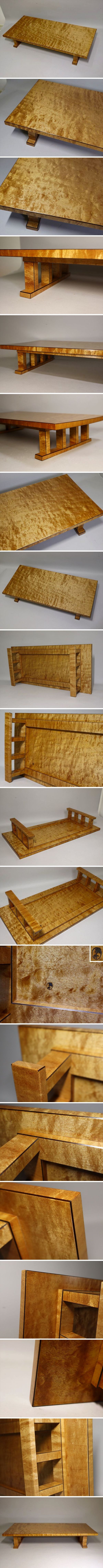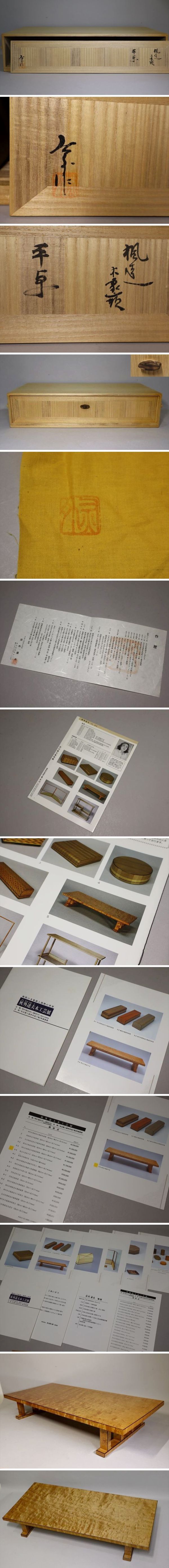本物保証。人間国宝灰外達夫先生による大変希少な作品で、百貨店個展「灰外達夫木工芸展」及び、石川県立美術館「石川県作家選抜美術展」出品作品です。木肌の美しい楓の木材に繊細な木象嵌が施された見事な仕上がりの作品です。木象嵌は色の異なる木材をミリ単位の細さで嵌め込む技で、木の美しさを最大限に引き出す事ができます。経年による反りや小いたみがあります。シンプルな中にも気品が漂う素晴らしい出来栄えです。