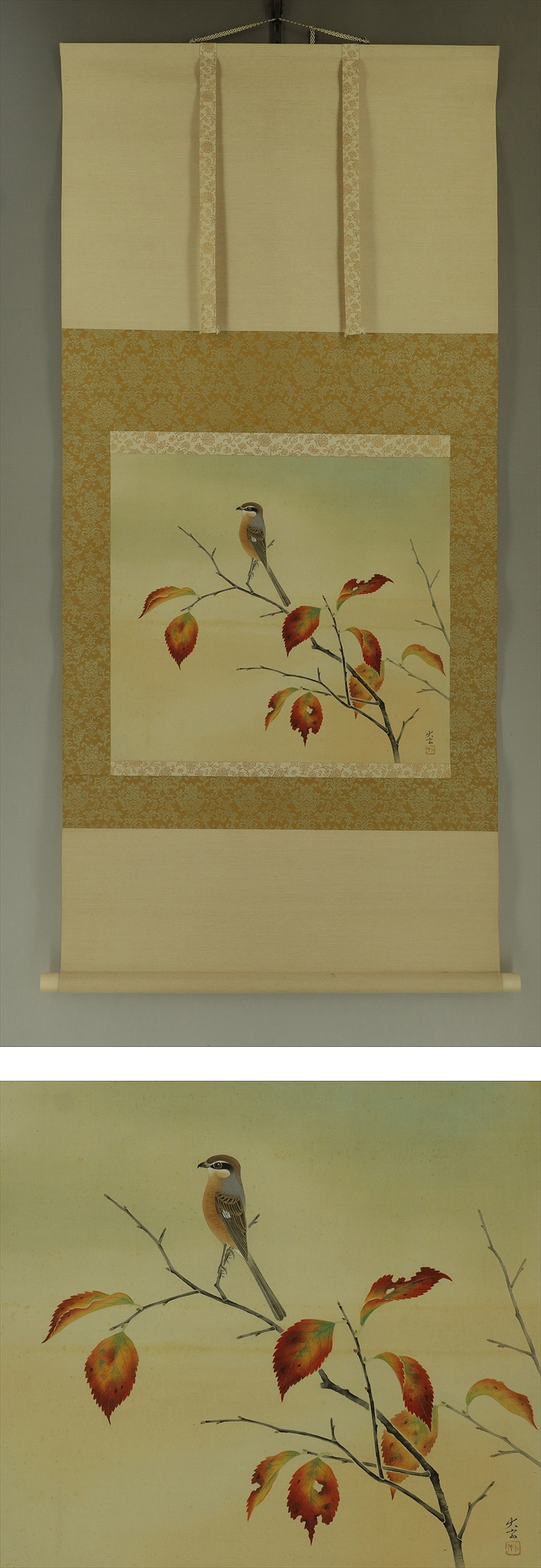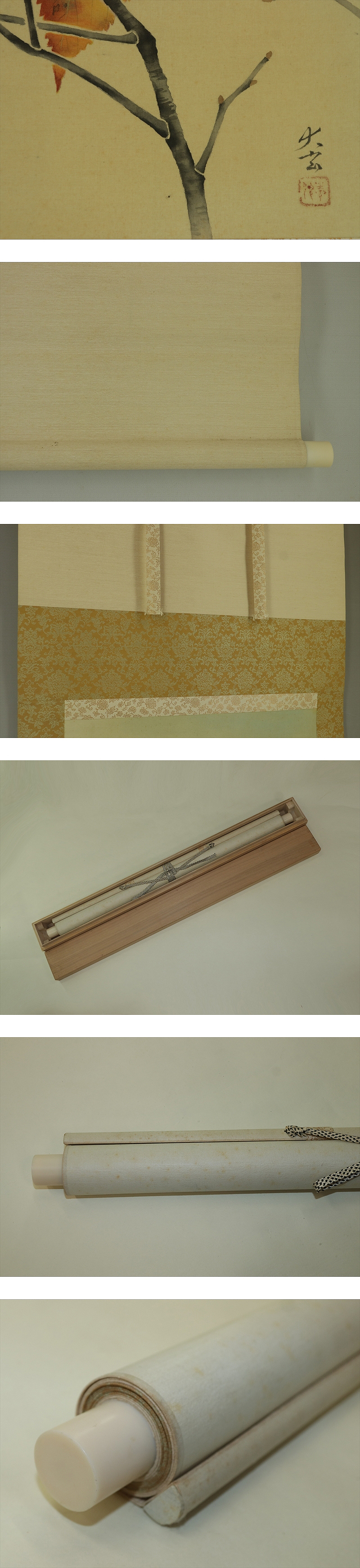 横山大玄、(よこやま たいげん) (1898年~1977年) 日本美術院院友、昭和初年故横山大観夫婦の養子となり, 大観没後は自宅を大観記念館として開放し,大観の作品や資料を公開, その館長をつとめていた、得意花鳥、昭和52年没。79歳。 本紙は、染み、軽い折れ、皺、ヤケがあります。 表装は、染み、汚れ、皺があります。 【サイズ】 作品 横約50.5cm×縦約46cm 表装 横約65cm×縦約141cm |