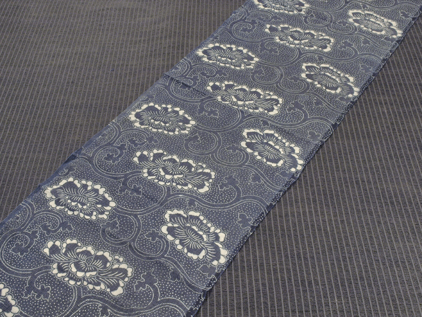 深く沈んだ青藍(せいらん)色の地に、更紗調の唐花草の文様が染め抜かれている、綿の藍の型染のはぎれです。 明治期ごろにつくられたと思われるアンティークのお品です。太めの糸でやや中厚地ですが、やわらかな手ざわりです。 画像のとおり、全体的に褪色しており、両耳と中とで色差があります。また、両耳直近に縫い跡があり、直径約 5mm-1cm のヒケ穴がちらほらとありますが、そのほかに目につく大きなしみやよごれ、褪色、穴などのダメージはなく、この時代のものとしては良好な状態です。生地の力もあります。※風楽の出品内で同じ柄のものを複数出品している場合もあります。 |