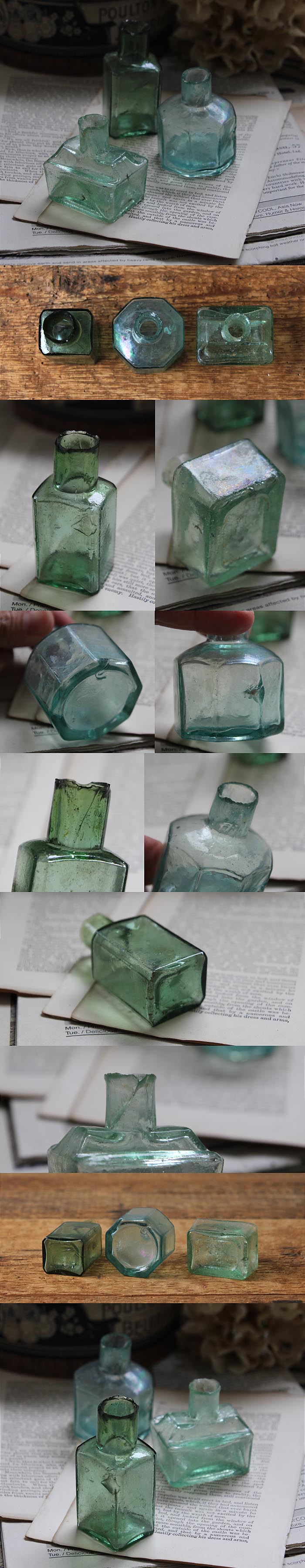 ●イギリス アンティーク ガラスインクボトル3個 インク瓶 インテリア 雑貨 フラワーベース 店舗什器「一輪挿し」K-960 收藏