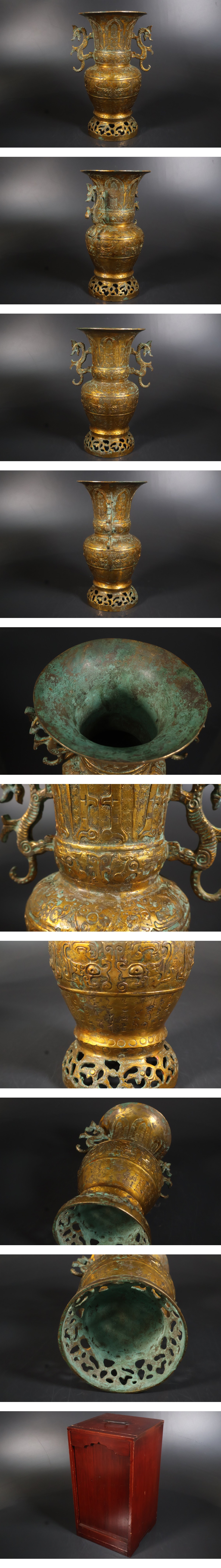 【小】5428 コレクター収集買出品 中国古美術 古玩 鍍金古銅獣面耳付花生 鍍金青銅器 饕餮紋 銅器 保管箱有 細密細工 唐物 收藏