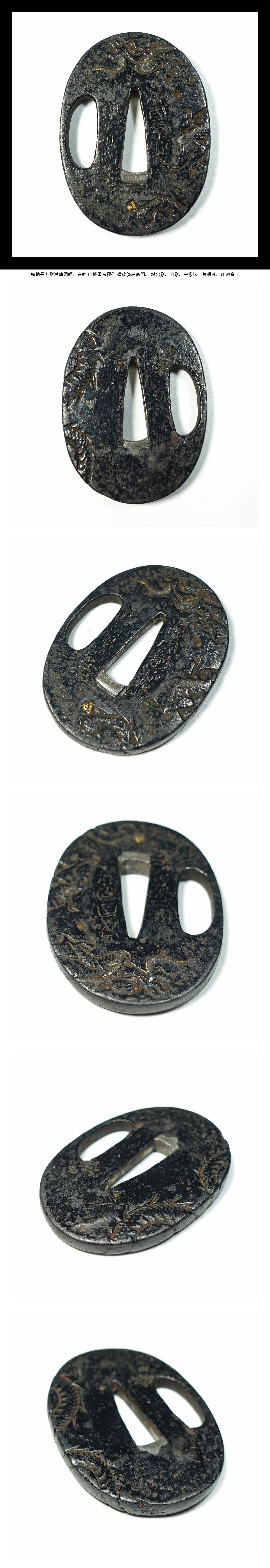 ★在銘 喰出鐔 鉄地長丸形潜龍図鐔 鋤出彫 毛彫 金象嵌 片櫃孔 細密金工 短刀鐔 鍔 刀装具 日本刀 拵 外装 懐刀 【鐔T01】 收藏
