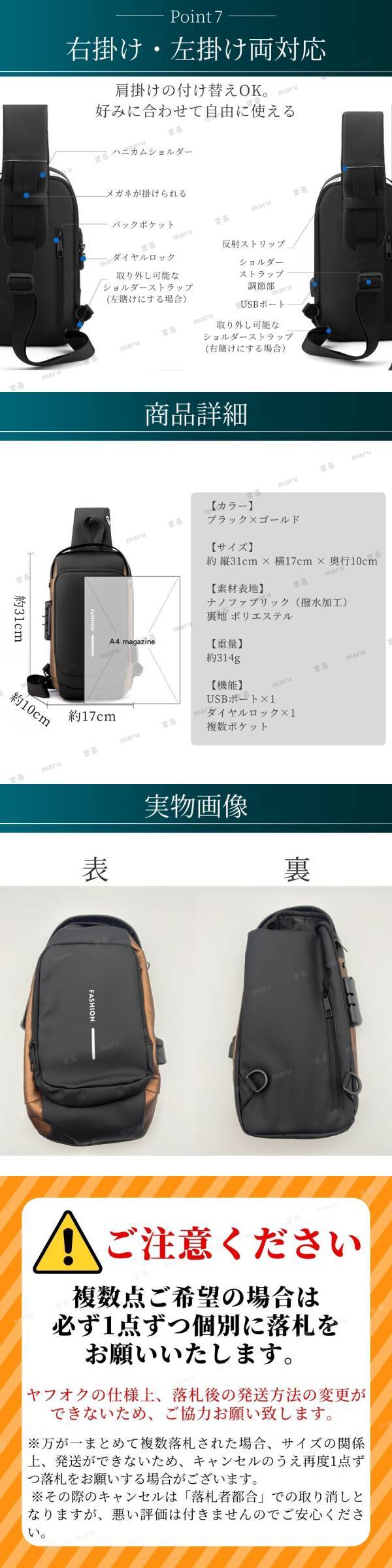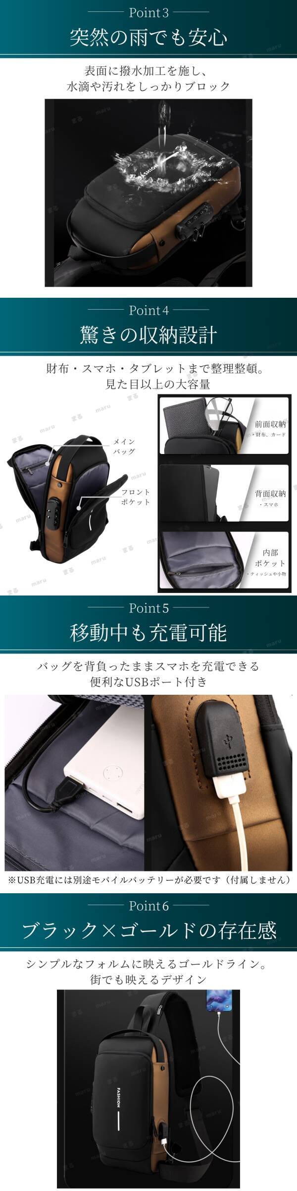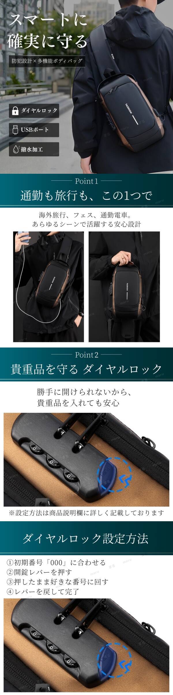 ショルダーバッグ ボディバッグ USBポート ダイヤルロック 盗難防止 軽量 防水 撥水 斜めがけ 肩掛け ブラック ゴールド メンズ 大容量 鍵 收藏