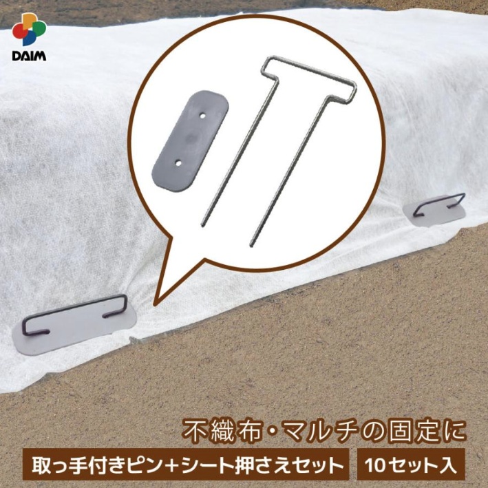 DAIM 第一ビニール取っ手付シート押さえクリップ 10P■特長・不織布やマルチ固定にご使用いただけます。・取っ手付きピンとシート押さえがセットになっています。■仕様・サイズ:長さ 17cm・入数:10個入・取っ手付ピン色:シルバー・シート押さえ色:グレー・材質:スチール、ポリプロピレン