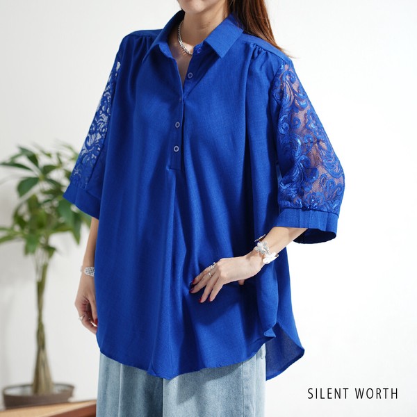 新品 インクブルー SILENT WORTH サックス レース袖 シャツ チュニック M レディース ゆったり Aライン 体型カバー 春 夏 秋 ブラウス 收藏