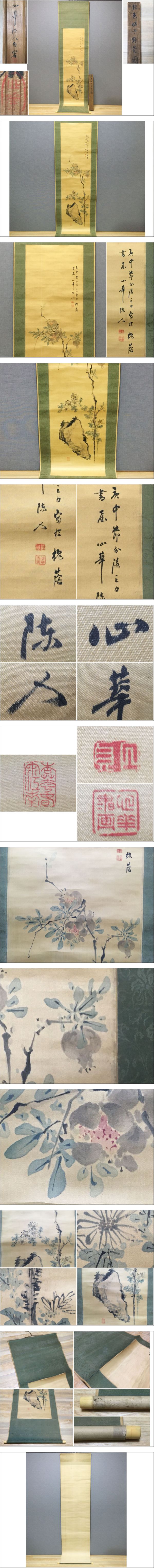 「設色榴子野菊図」白須心華 掛軸 掛け軸 篆書体 古美術 掛物 茶掛け 美術品 古道具 茶道具 蔵出し品 骨董 共箱箱付き K-17 收藏