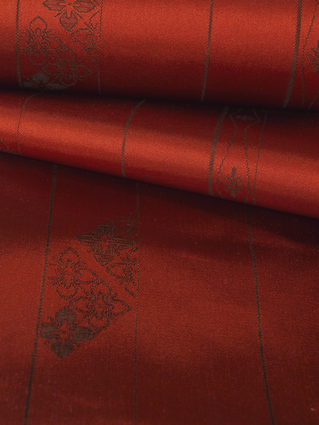 紅海老茶色の地に、唐花菱と立涌の配された(たてしま)の文様が織り込まれている、綸子の雨コート地の反物です。 赤茶色系のお色ですが、沈んだ深みのあるお色です。なめらかでやわらかなな手ざわりの化繊地です。 未仕立て未使用保管品です。一巻めに直径約 1mm のごくうっすらとしたうすよごれが 1 か所ありますが、判別はつかず、洗える着物なので、お洗濯できれいになりそうです。綴じられているため中までは確認できませんが、しみやよごれ、褪色などのダメージはなさそうです。 ※風楽の出品内で同じ柄のものを複数出品している場合もあります。 |
