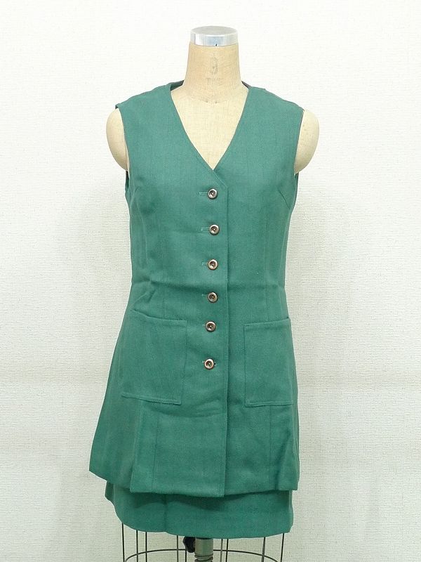 60SR41★昭和バブリーで鮮やかなグリーンが綺麗なヴィンテージスカートスーツ ベスト 上下セットアップ 昭和元禄アングラポップ 收藏