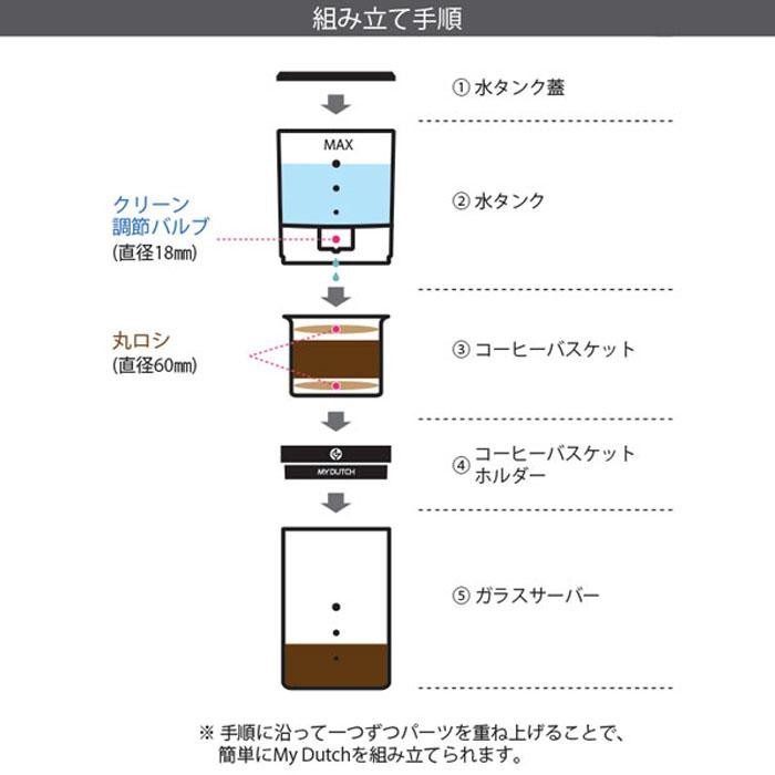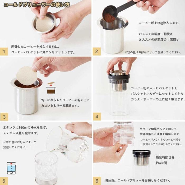 | 仕様 | 食洗機・電子レンジ:使用不可 耐熱温度:70度 抽出時間:約4時間(約1秒/滴) 粉使用量:60g(MAX) 水タンク容量:約350ml(MAX) |