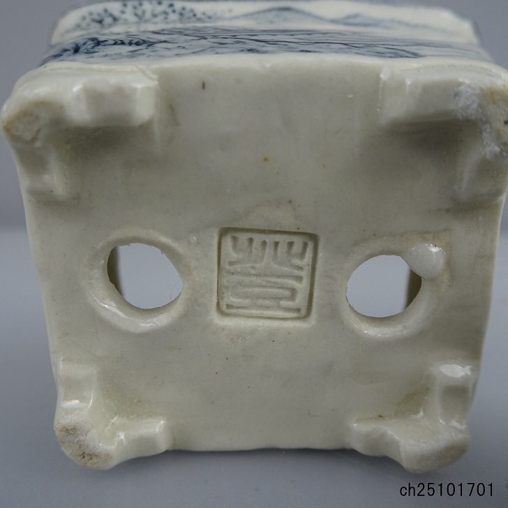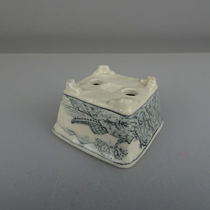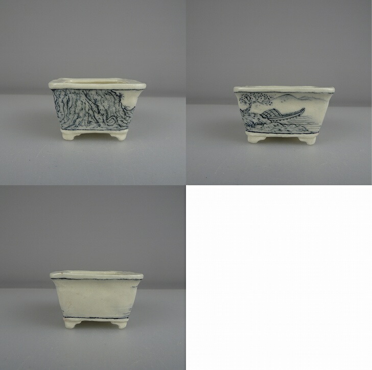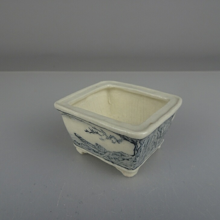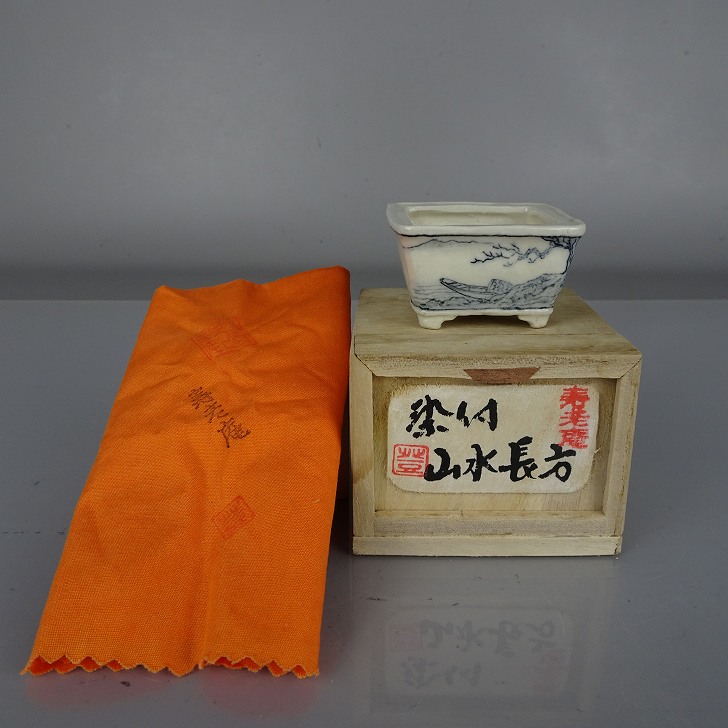 盆栽鉢 宇野 登 寿老庵 豆鉢 長辺 約 5cm 長方鉢 染付 山水画 共箱 共布 鑑賞 観賞用 現品 新品 收藏