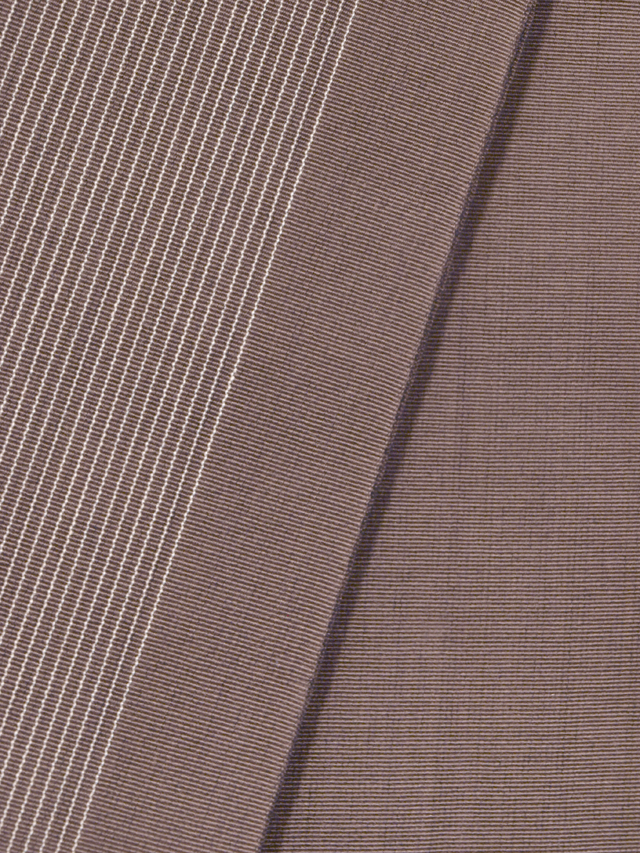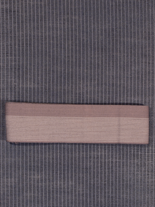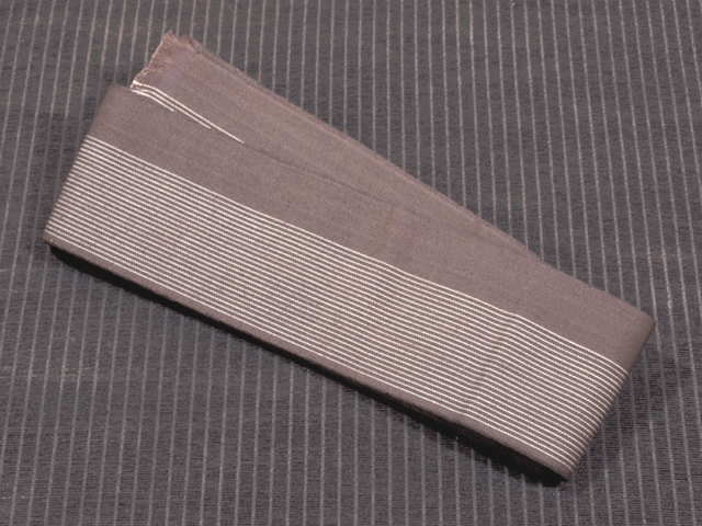 煤竹(すすたけ)色の地に、白色の縞の文様が織り込まれている本場筑前博多織の角帯です。小袋帯です。 ココアのような地色がモダンな粋さを醸しています。帯芯は入れられていず、帯端の折り返しと綴じはありませんが、このままお使いいただけます。 ユーズド品と思われますが、使用感はあまり感じられません。裏面に直径約 2mm のこまかなうすよごれが 1、2 か所ありますが、そのほかに目につくしみやよごれ、褪色などのダメージはなく、きれいな状態です。 |
