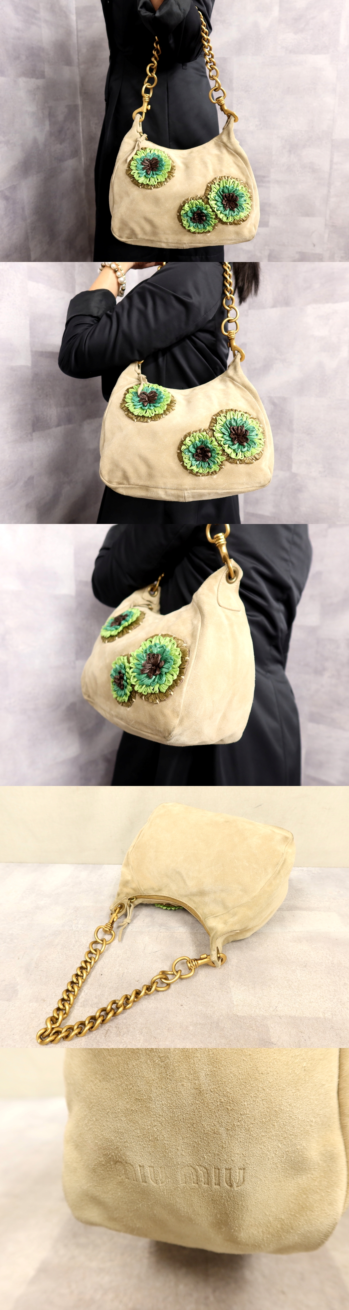 美品●ミュウミュウ●アーカイブ●フラワーモチーフ●スエード レザー 本革●チェーン ショルダー バッグ●ブラウン系 緑●G金具●Js62435 收藏