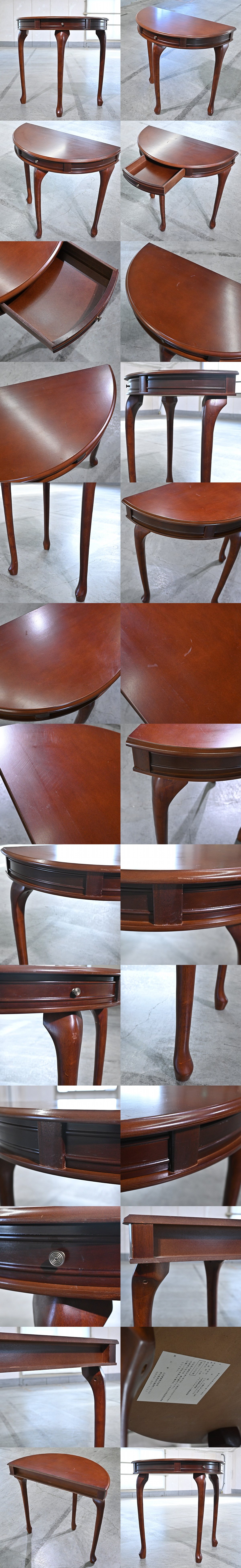 ビンテージテイスト コンソールテーブル マホガニー無垢材 半円 ハーフムーン 引き出し 収納 飾り台 クラシカル 玄関 猫脚 リビング 机 收藏