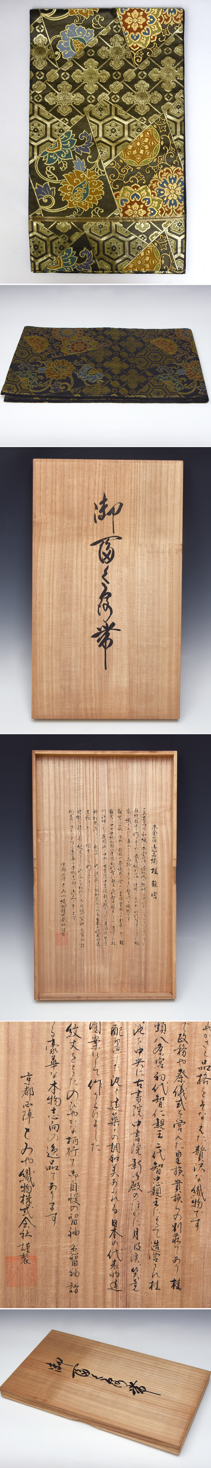 とみや織物株式会社 謹製 金糸 本金箔 御富久路帯 御冨久路帯 袋帯です。 非常に精巧な製織の技術が感じられます。 帯の内側には「川島織物」あり。 箱の裏には本袋帯の詳細が細かく書かれております。 丁寧に保管管理されていたためほとんど使用歴のない品物です。 ※撮影の際に生じた写り込みなどがございます。 ご理解の程よろしくお願い致します。 |