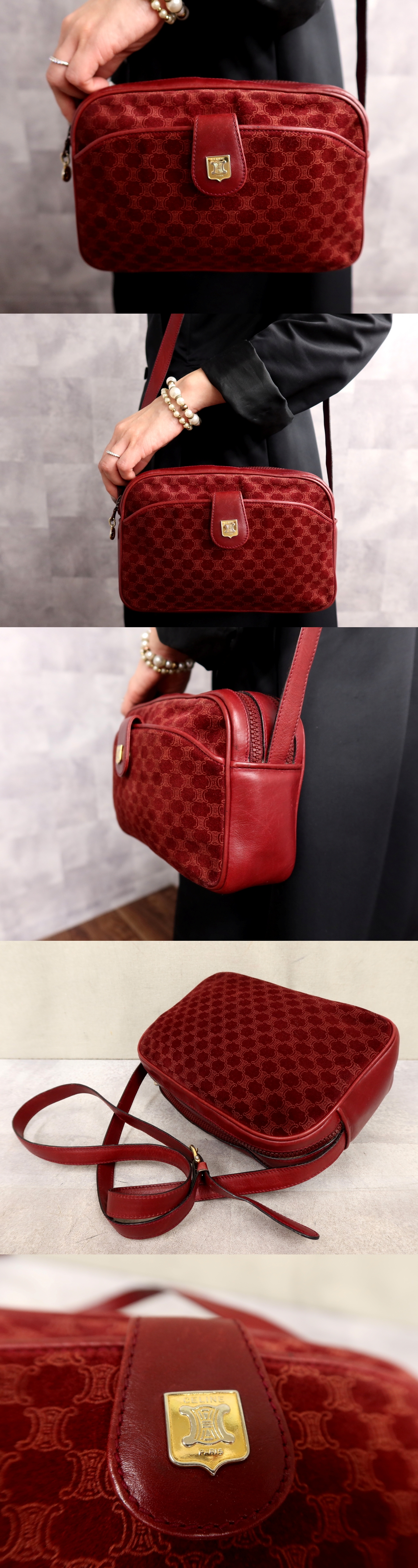 ●超美品●CELINE セリーヌ●マカダム●スエード カーフ レザー 本革●ショルダー バッグ●ボルドー●ゴールド金具●収納 かばん●Js64575 收藏