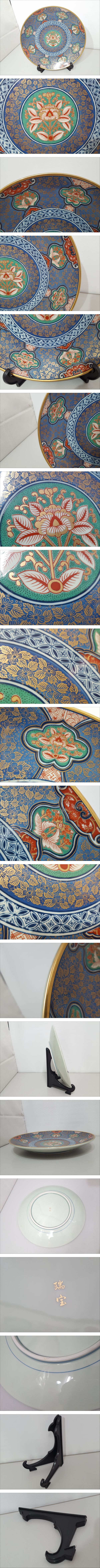 【うぶだし】瑞宝 造 金彩色絵 花文 飾り皿/皿立て付き/直径約31cm/高さ約4cm/大皿/絵皿/盛皿/在銘/茶器/床の間飾り/茶道具/LNX70-8 收藏