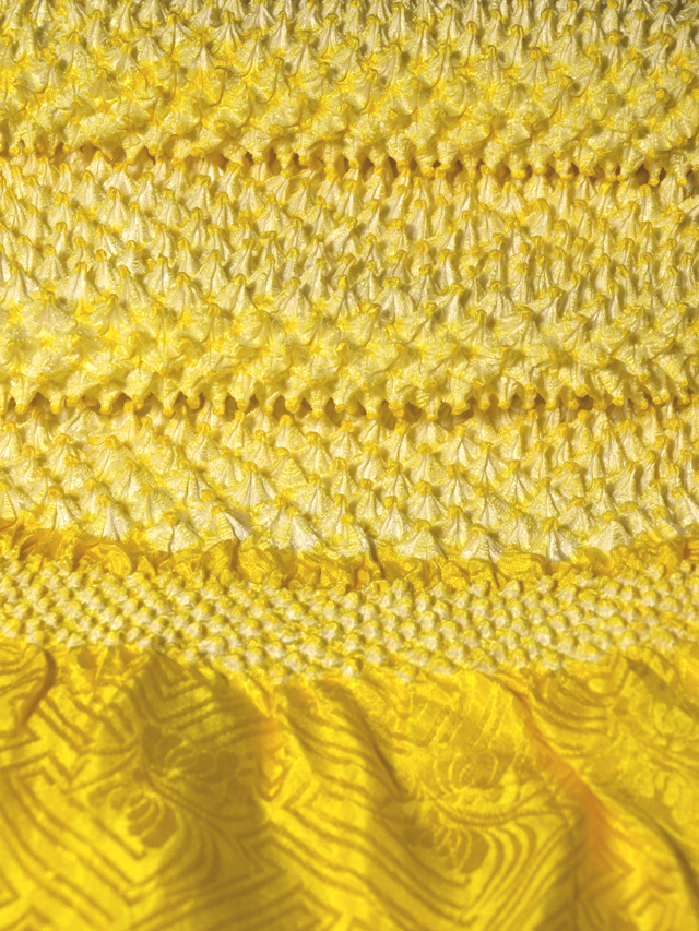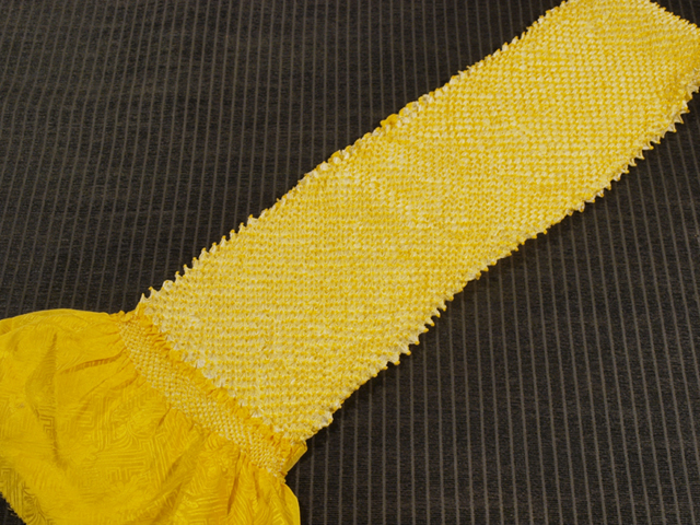 中黄色の地に、本紋(紗綾形に花)の地紋が織り出され、総絞り染めが施されている綸子の帯揚げです。 ユーズド品で、端部から約 3cm に直径約 5mm のくすみが 1 か所ありますが、ほとんど判別はつきません。そのほかに目につく大きなしみやよごれ、褪色などのダメージはなく、きれいな状態です。 |