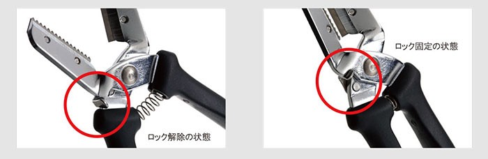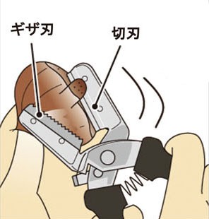 | 栗くり坊主はハサミ式で、片方に切れ味の鋭い切刃が、 もう一方にはギザギザの刃がついています。 ギザ刃で栗を押さえて、握ると切刃が動きます。 それを少しずつ繰り返すことによって、リンゴの皮をむくように、 栗の鬼皮と渋皮が一緒につながって切れます。 | |