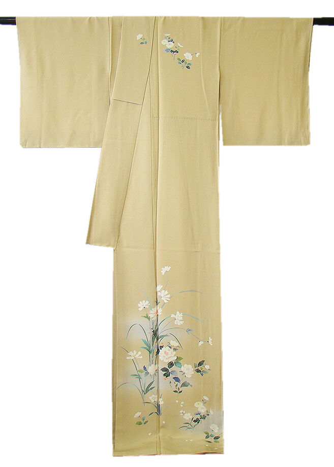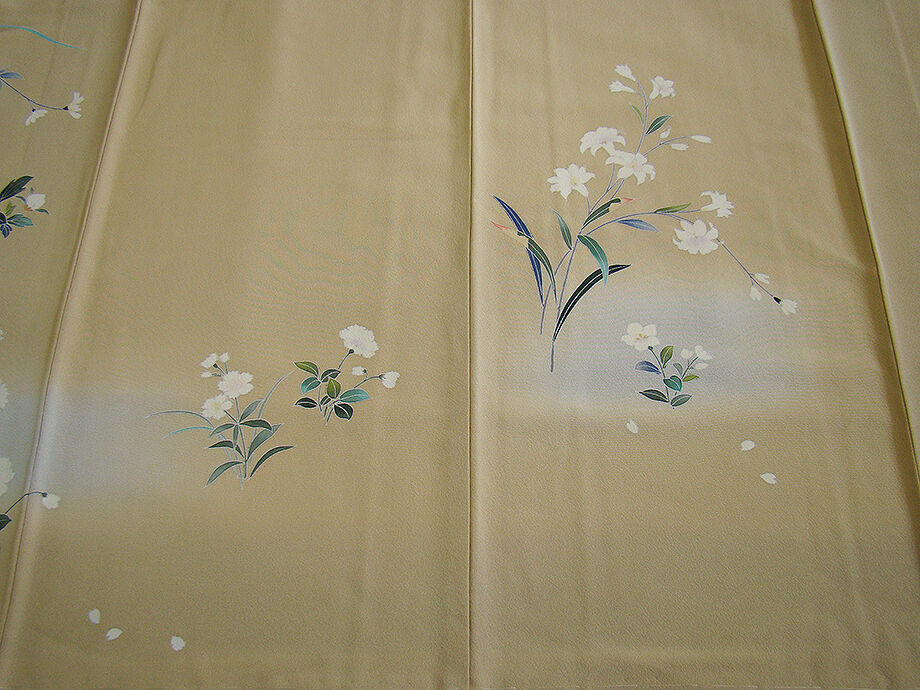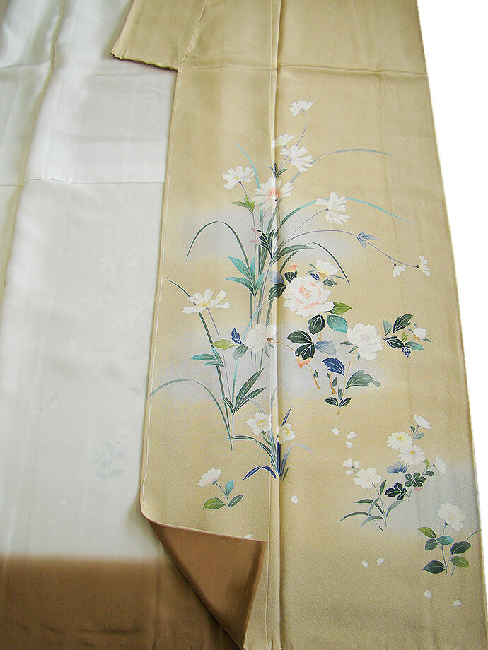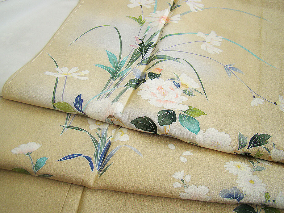 | 商品説明 | こちらのお品は「袷」ですので10月から5月までお召頂ければと思います。 とてもしなやかで柔らかな手触りの着心地良い上質な重めの極上ちりめん地の生地、 浅黄色地に薄青色ぼかしに白、青、緑、黄色等の花草柄の本加工染、 気品に満ち溢れた彩りが正統派のお着物として一枚は欲しい逸品の素敵なお着物です。 八掛は薄茶色(正絹)、幅広い年代の方にお召頂けます。 |