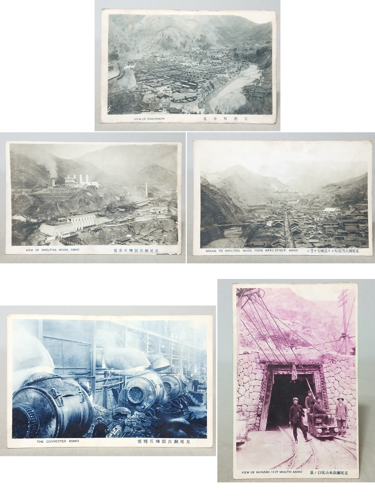 【戦前・絵葉書】 足尾銅山 5枚 足尾町 製煉所 轉爐 間藤町 本山坑口 // 古写真 資料◆栃木県