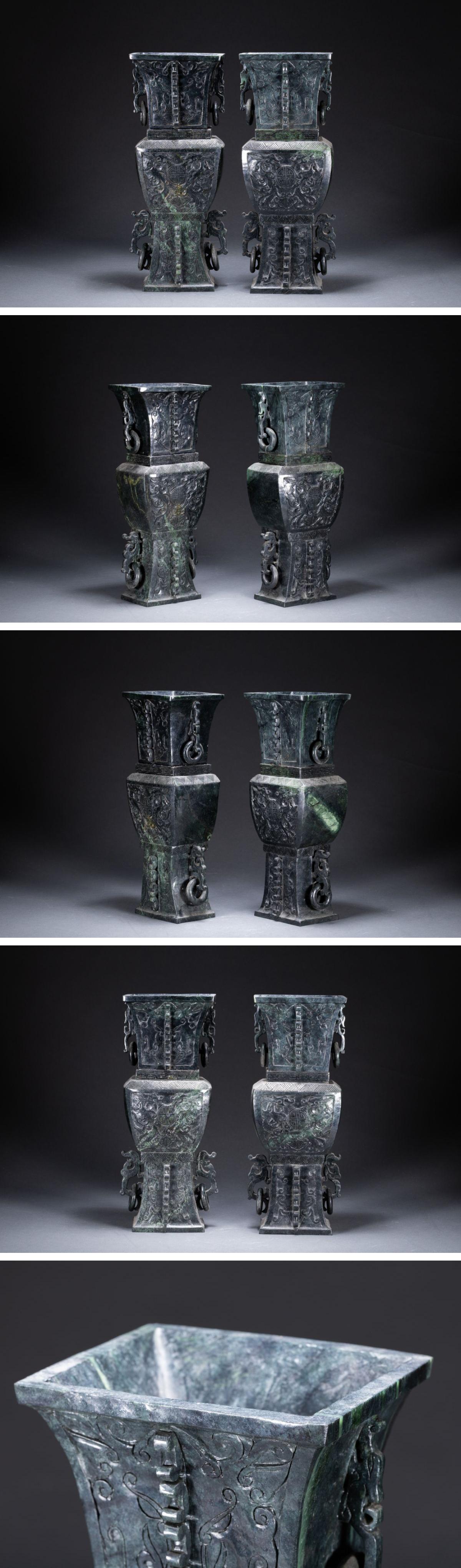 【清】関西某オークション購入 中国・時代物 天然碧玉 龍紋環耳尊一双9kg 極細工 古置物 古擺件 中国古美術7L11-24S7