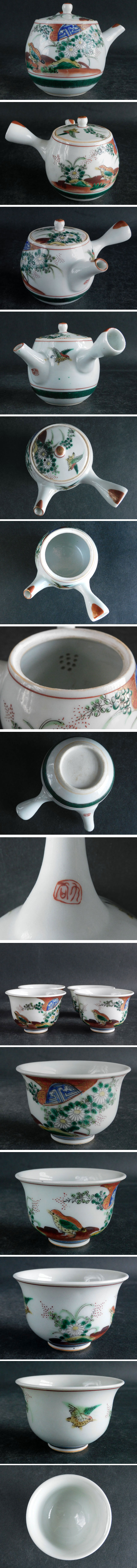 時代 九谷焼 陶泉 色絵 花に鳥図 煎茶器 急須 茶碗 冷まし 煎茶道具 收藏