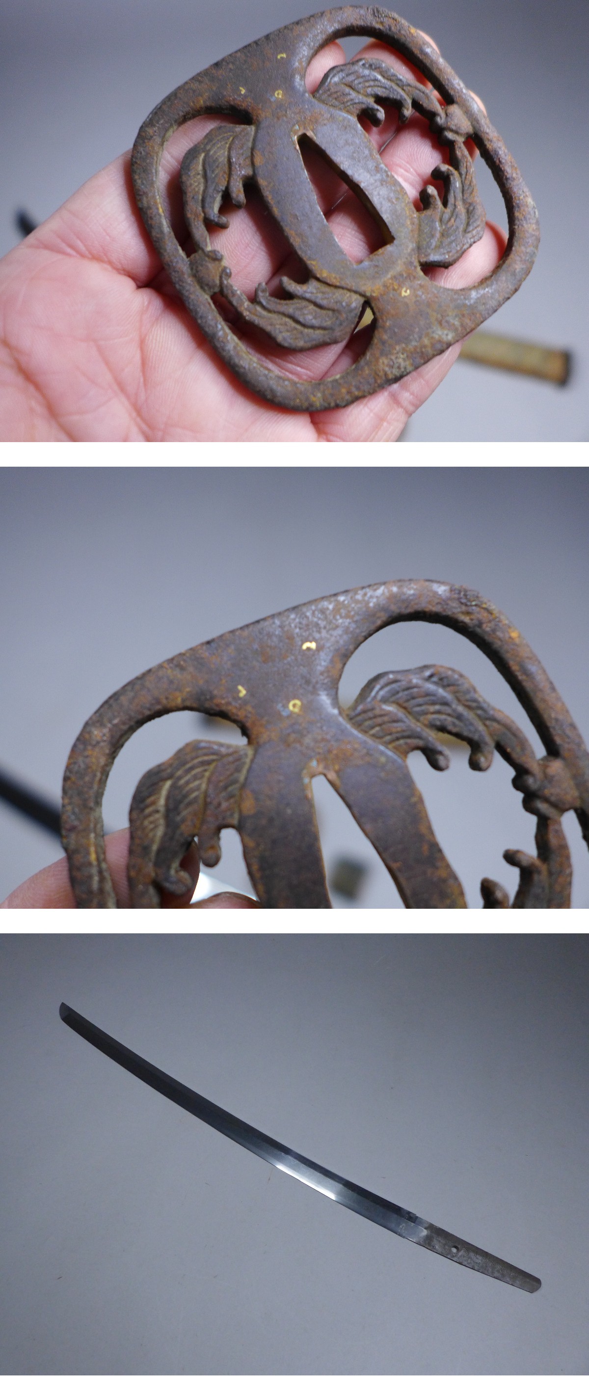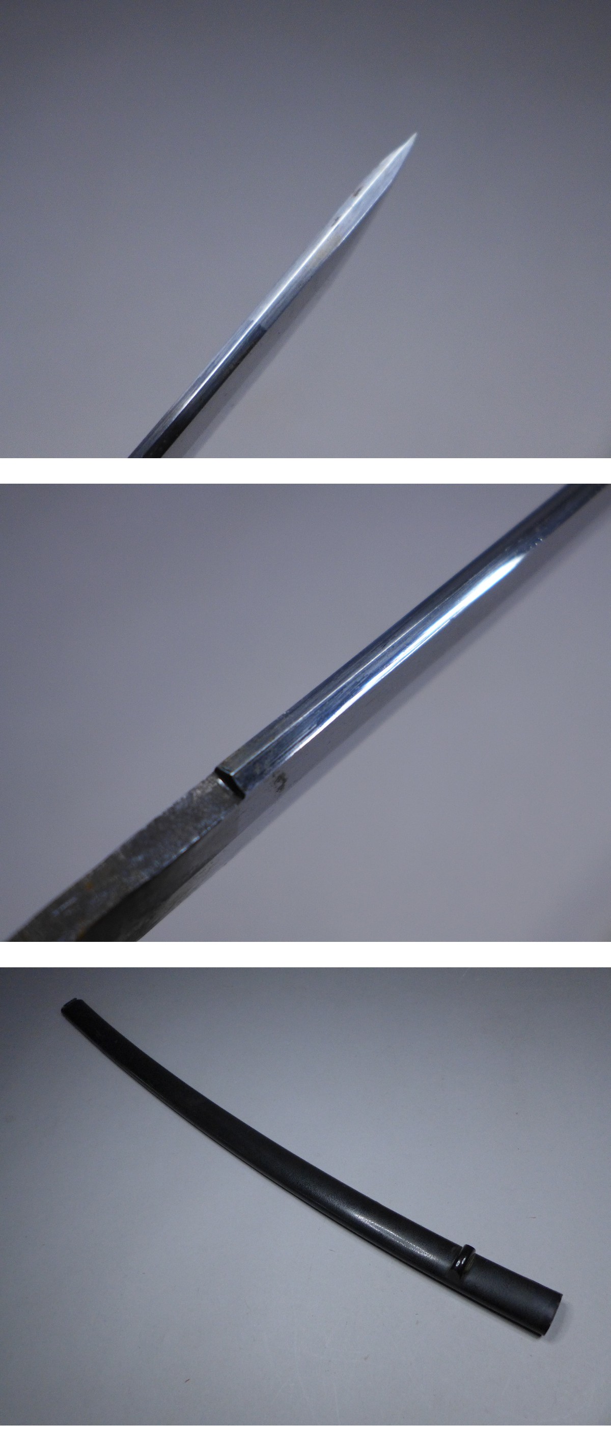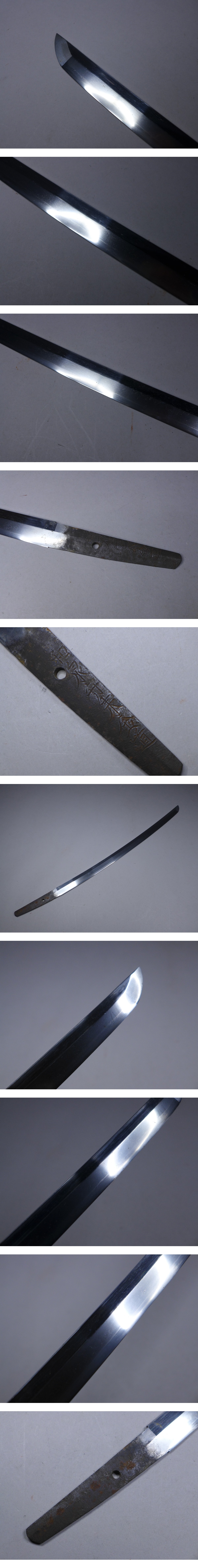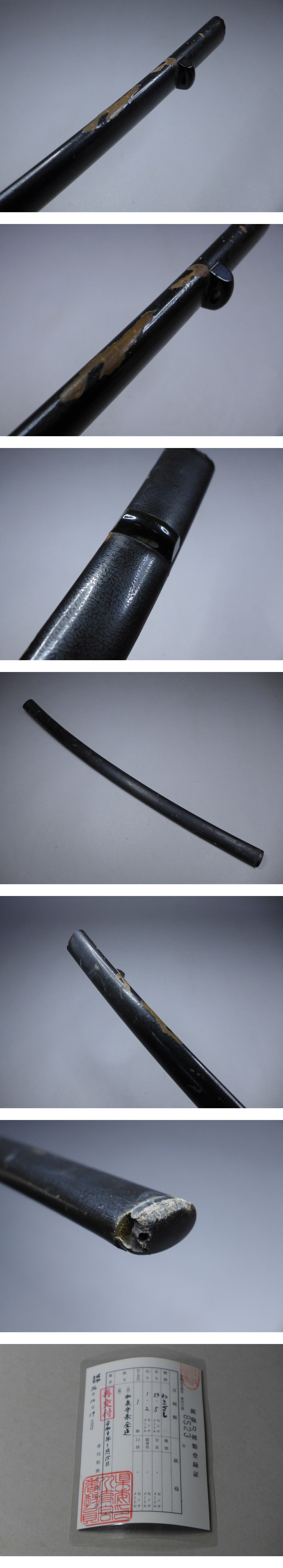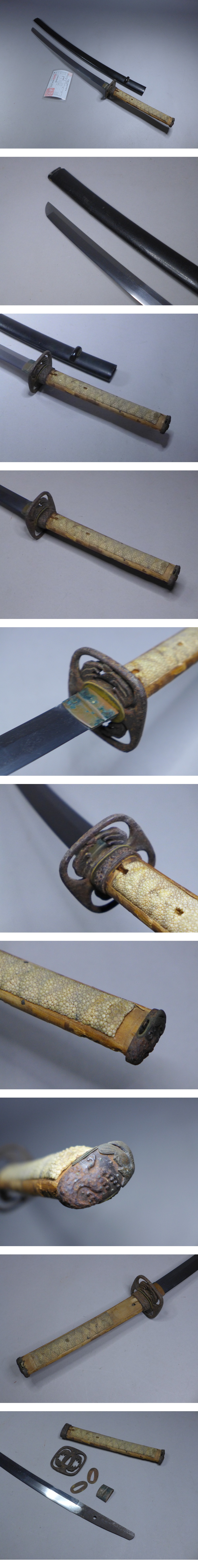 詳細サイズは画像の登録証をご覧下さい。先巾:約21mm。元巾:約28mm。先重:約4・5mm。元重:約6・5mm。刀身重量:約496g。キズなどあり。当方このような物に詳しくない為に詳細などは分かりかねます。状態は画像参照でお願いします。ご了承の上お願いします。★★★落札者は、落札して購入後、銃砲刀剣類所持等取締法に もとづき都道府県の教育委員会に所有者変更の届出が必要です。★★★★★★★★★★★★★★★★★★★★★★★★★最近、悪質な入札者が多く非常に迷惑をしております。新規IDや「非常に悪い・悪い」の評価の多い方の入札はお断りさせて頂きます。 仮に入札があった場合でも、発見次第入札を削除させて頂く場合がございます(判断基準は弊社判断によります事予めご了承下さい。
