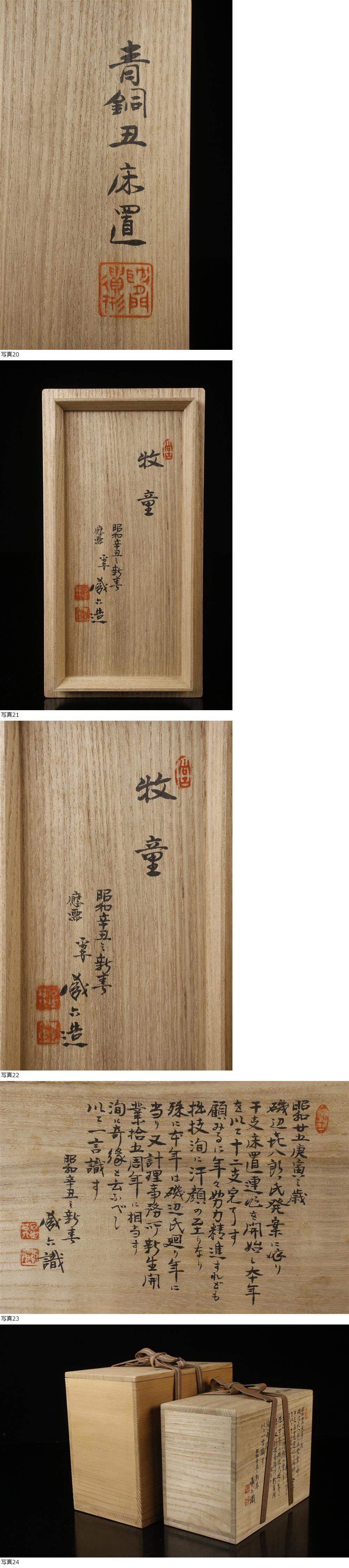 ⑧ 25121801* * * 商品詳細 * * * ここでしか出逢うことのできない唯一の美をご紹介させて頂きます。 四代秦蔵六による応需作品 干支連作の一点、牧童床置です。 干支の 丑 を象徴する作品で、雄大な背景が目に浮かぶような長閑な雰囲気があります。 人々と寄り添う様は穏やかで、野性の抜けた牛と人との間に生まれた絆を思わせます。 力強くも優しい造形表現も素晴らしく、和やかな声が聞こえてくるような情感溢れる逸品です。 貴重な作品をこの機会に是非お手元にてご堪能下さい。 四代 秦蔵六 1898年 生まれ 二代秦蔵六に師事 技術保存資格者 京都金属工芸協会長 1984年 逝去 ■商品内容/置物、共箱、二重箱 ■サイズ/横20cm×高13.5cm×奥行9㎝ 重量2.4kg 箱:横23cm×高17cm×奥行12㎝ 箱:横24.5cm×高21cm×奥行13.5㎝ ■状態/スレ、小キズ、サビ、箱にスレ、小キズ、シミがございます。 ※写真にてご確認、ご了承の上ご入札下さい。 * * * 支払詳細 * * * !かんたん決済 * * * 発送詳細 * * * 入金確認後3営業日以内に発送致します。 ※直接引き取りも可能です。 60~160サイズにつきましては 佐川急便、ゆうパックのどちらかで発送いたします。 ゆうパック発送の場合、弊社の発送日から追跡サービスに問合せ番号が反映されるまで 約1日ほどお時間がかかりますのでご了承下さい。 * * * 注意事項 * * * 運送中の破損があった場合は速やかに当社までご連絡下さい。 保険を利用するのに受取連絡後に運送会社による現場での破損状況確認が必要となります。 勝手に返送されますと保険の適用外となりますのでご注意ください。 * * * * * * お問い合わせ:082-236-8669 |