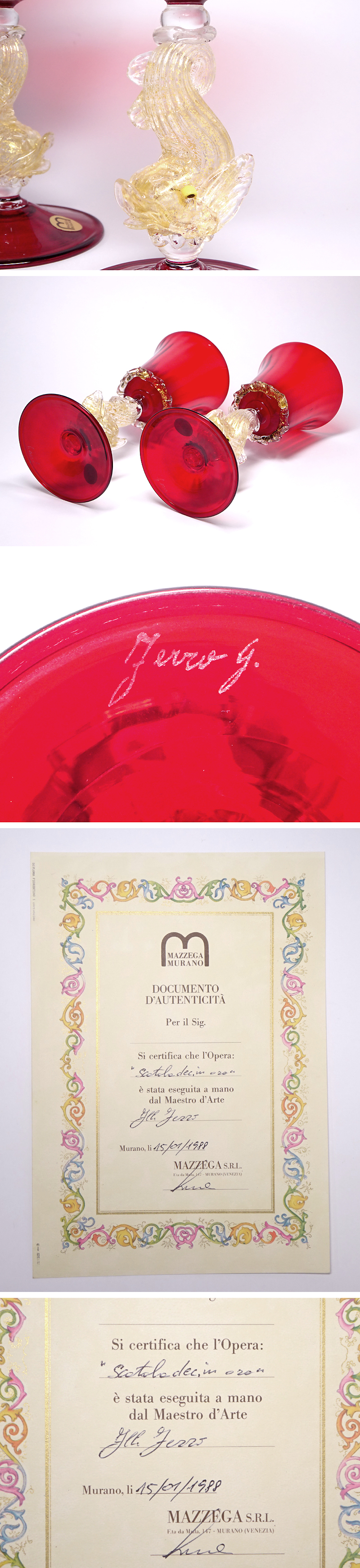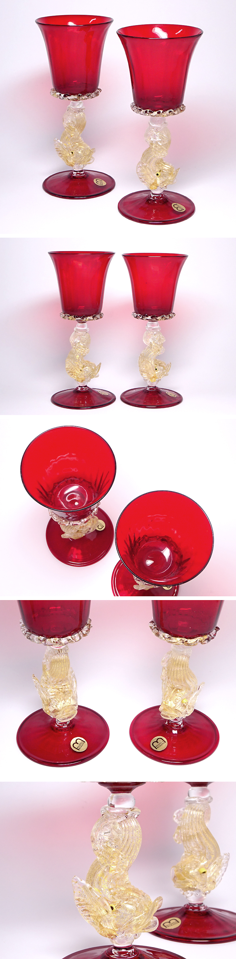 慶應◆イタリア 高級ムラノガラスの老舗【MAZZEGA MURANO】取扱品 銅赤ガラスワイングラス 金彩ドルフィンステム ペア 証明書付d2 收藏