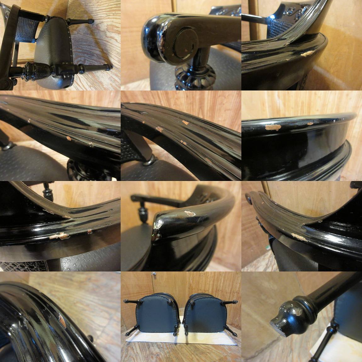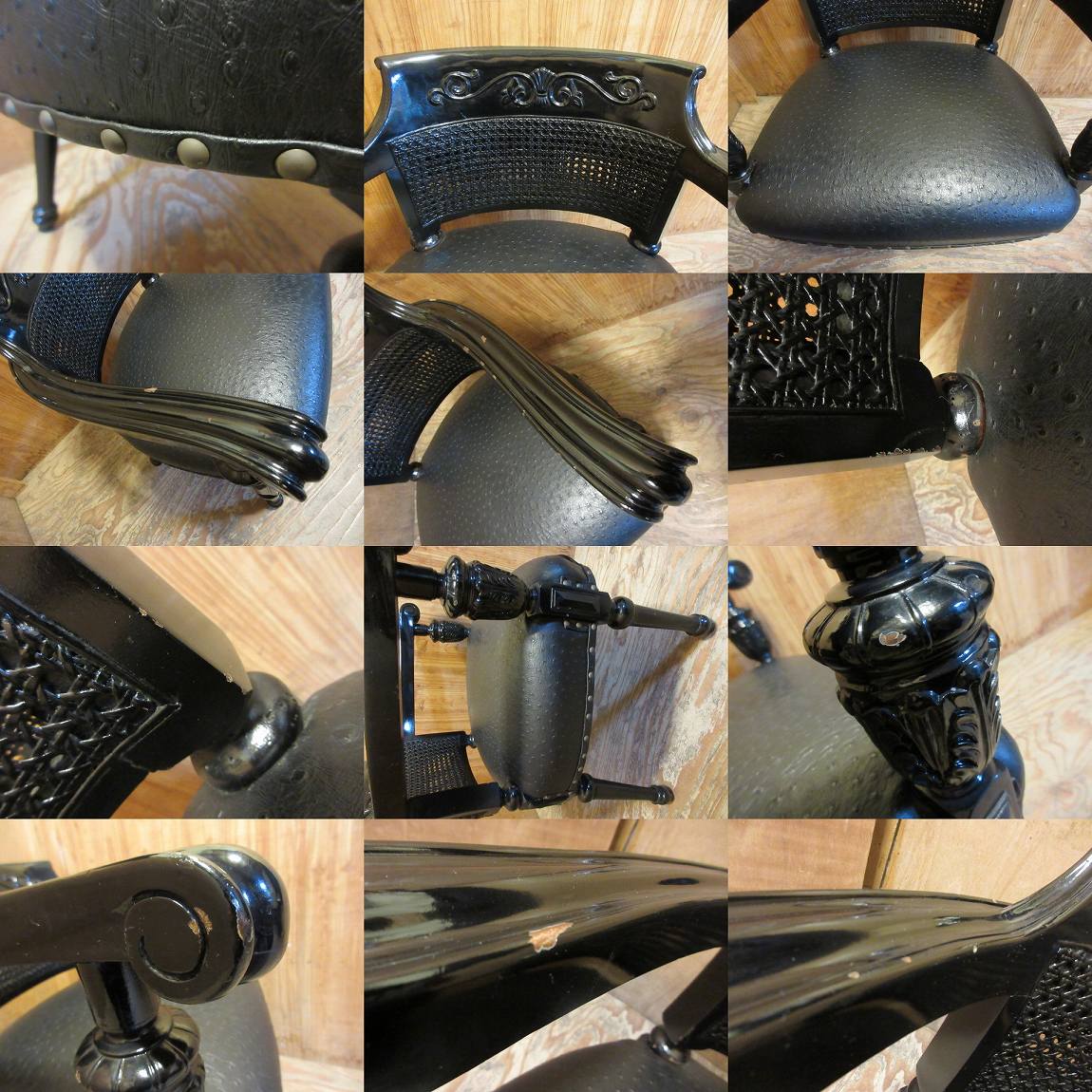 E578●木製■バロック調■ロココ調■アームチェア■2脚■イス■ラタンバック■鋲打ち■彫刻■座面オーストリッチレザー■中古品■黒 收藏