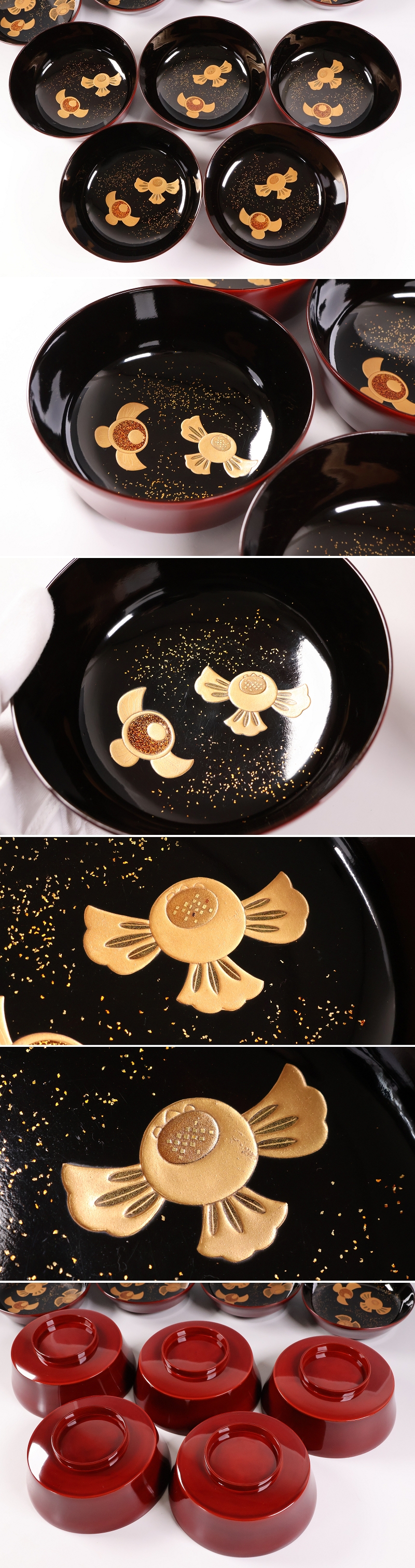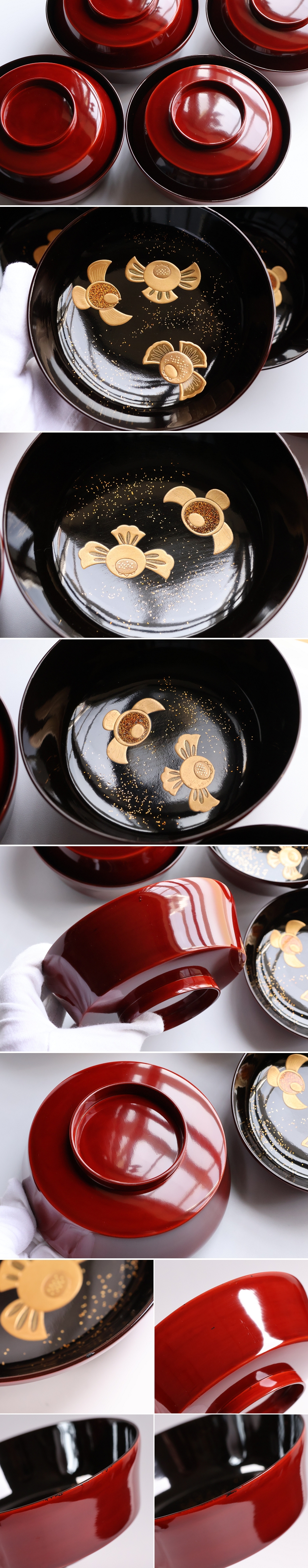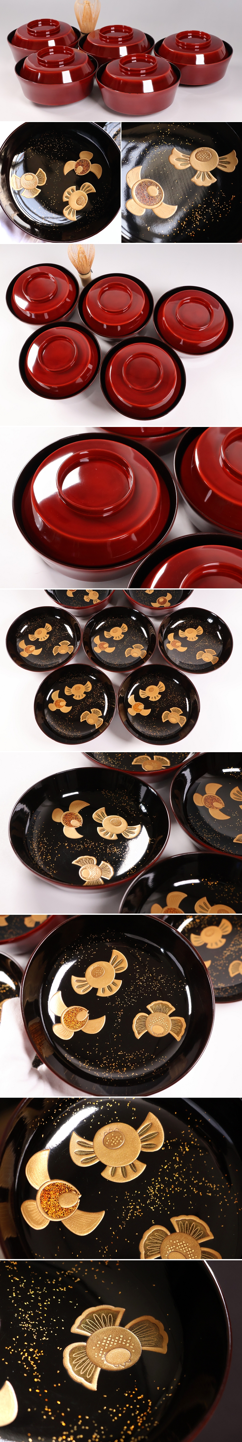 経年による擦れ、多少ヨゴレ、少々蒔絵のザラツキ、1客に少し切金剥げがございます