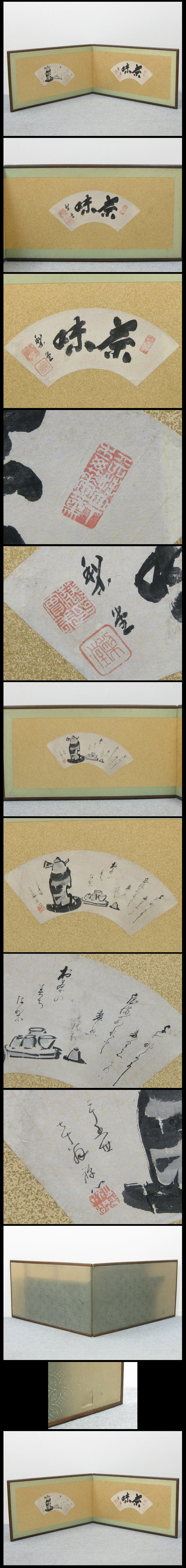 【心庵】二枚折屏風 扇面 梨堂(三条実美)総理大臣・煎茶図/肉筆 B1121 收藏