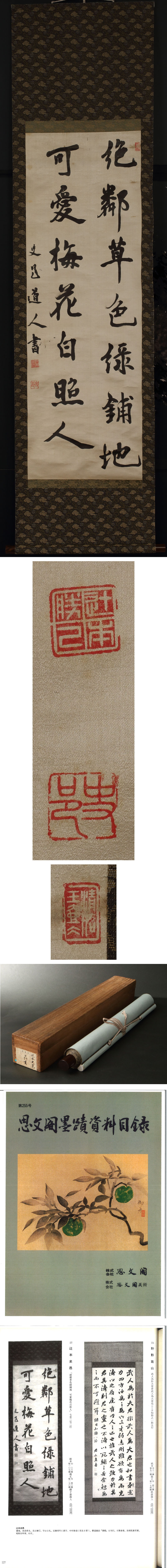 辻本史邑の二行書です。 「絶(はなは)だ憐れむ草色 緑(りょく)地に鋪き、愛すべし梅花 白(はく)人を照す」と認めております。明の軍人・劉基の七言詩の一節です。 辻本は帖学が主流であった関西書壇において清朝碑学を介し北朝の書風に傾倒しました。雄勁ながらも滑らかな運筆が感ぜられる書の逸品です。 『思文閣墨蹟資料目録』255号所載品です。 ◆辻本史邑 大正~昭和期の書家。奈良県生。名は勝巳、字は士礼、別号に寧楽庵主人・江村。桑山兼山・近藤雪竹・山本竟山等に漢字を、中村春堂・尾上柴舟に仮名を習う。書道雑誌「書鑑」を刊行、関西を中心に後進の育成につとめた。日展参事。芸術院賞受賞。昭和32(1957)年没、63歳。 付属:時代箱が付属します。 寸法:高さ169cm、幅44cm(最大幅。若干の誤差はご了承下さい) 状態:経年のシミ・イタミがございます。 |