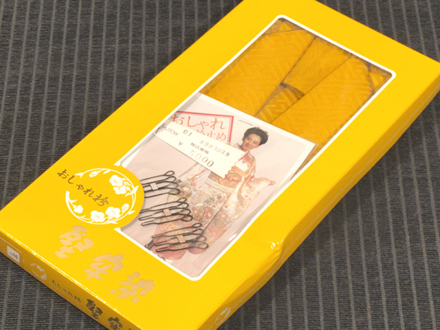 山吹茶色の地に紗綾形(さやがた)の地紋が織り出されている、綸子の伊達衿です。 未使用保管品で、しみやよごれ、褪色などのダメージはなく、新品同様です。留めクリップが 3 点付いています。 |