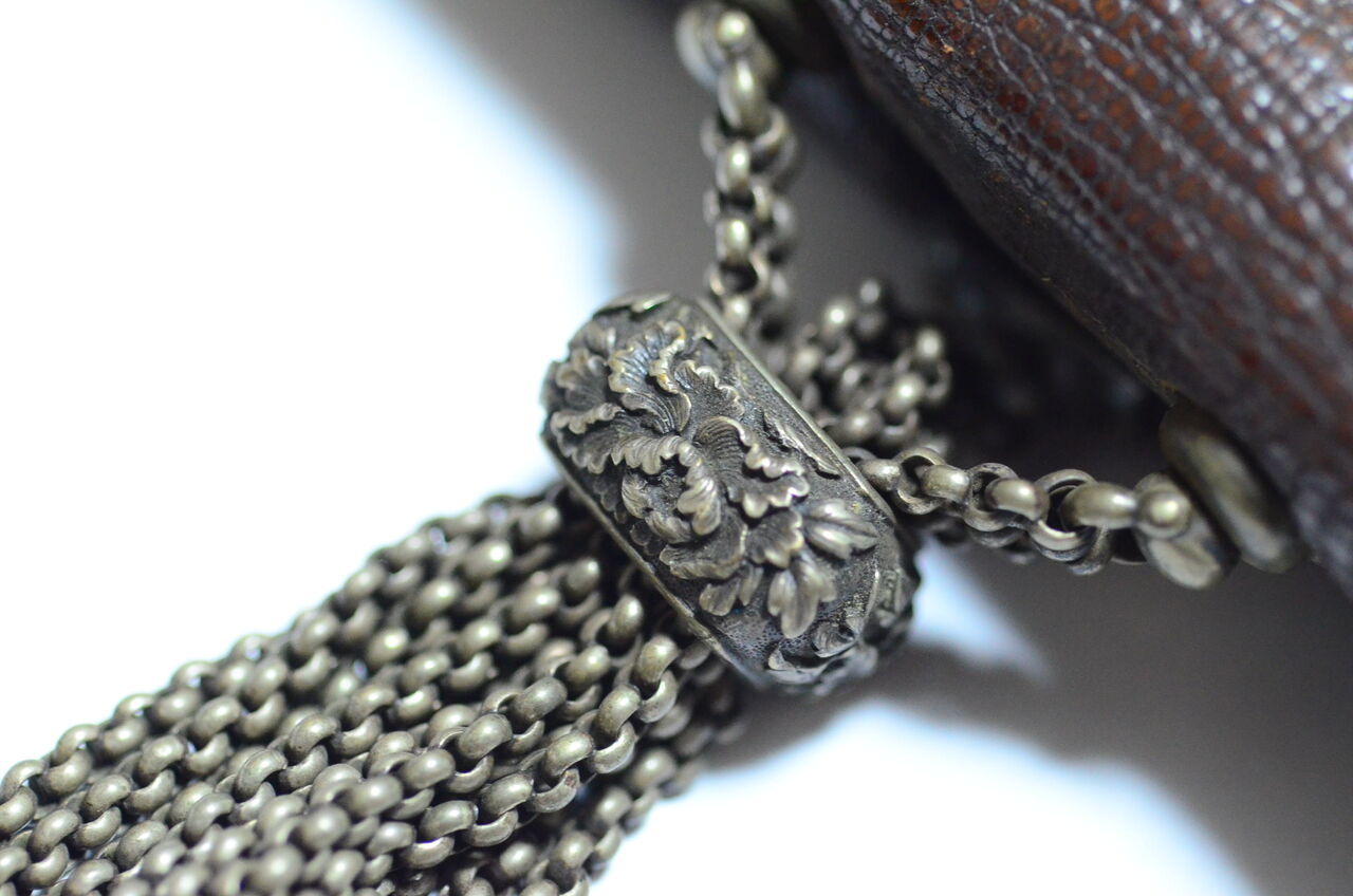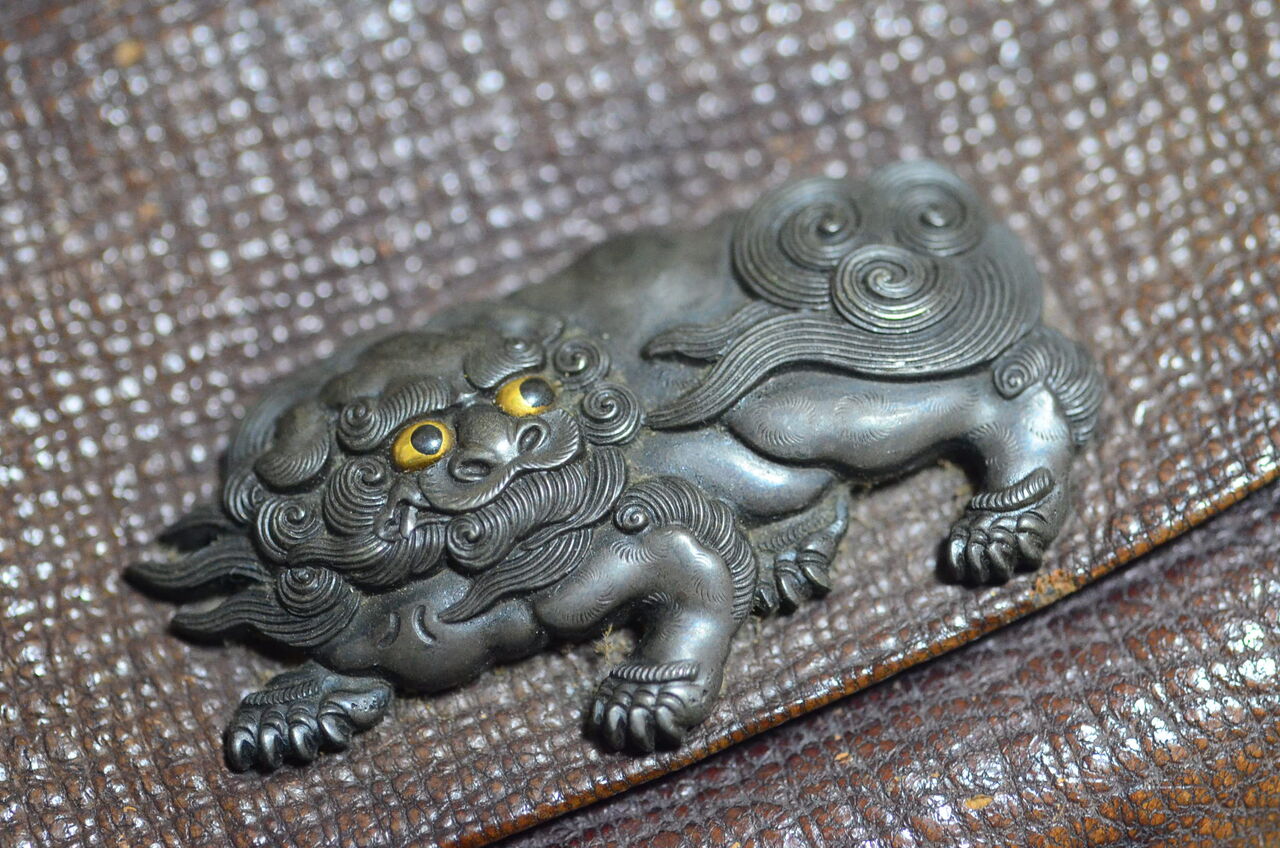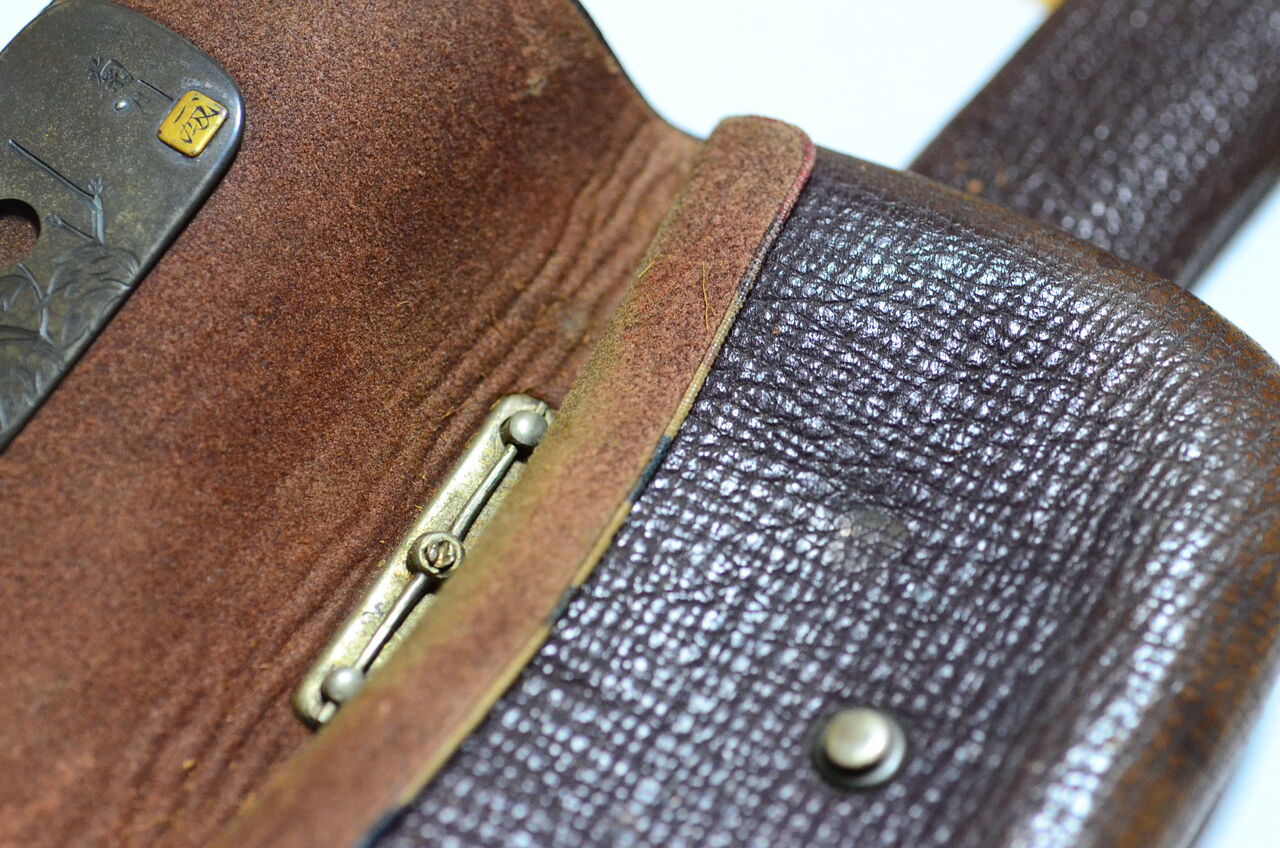 在銘 金工 菊川作 獅子前金具 革製煙草入 銀鎖金具 根付 革煙管筒 提げ物 山形市旧家蔵出 骨董 画像20枚掲載中