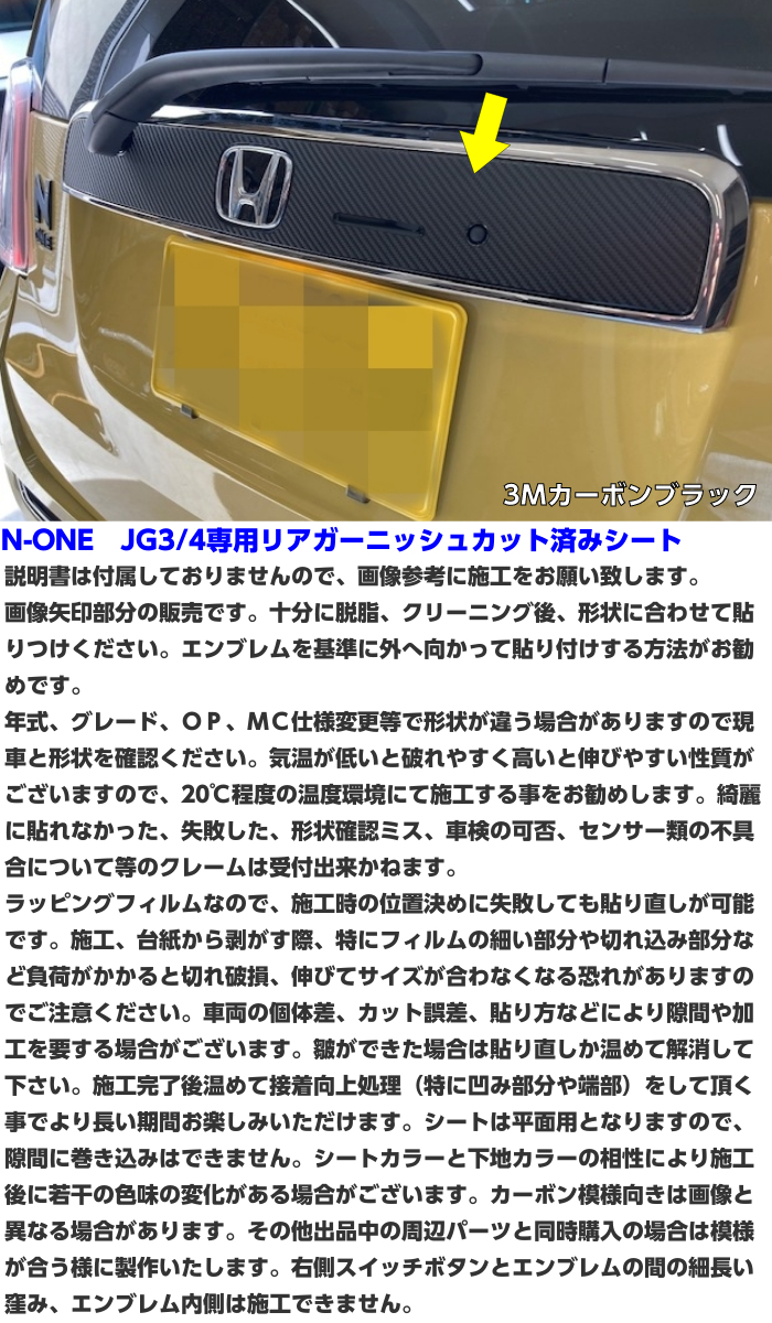 ※ご連絡なくお支払が終わっている場合はカーボンブラックにて発送させていただきます。 ③車両専用ラッピングシート ラッピングシートは剥がす際に糊残りがしにくく、貼り付けに失敗した場合でも 貼り直しが可能です。 当店では、雨、紫外線、風埃、熱等の環境が過酷な自動車には車両専用のシートをご使用される事を推奨しております。 ◆商品詳細◆ ★商品名:N-ONE JG3/4系