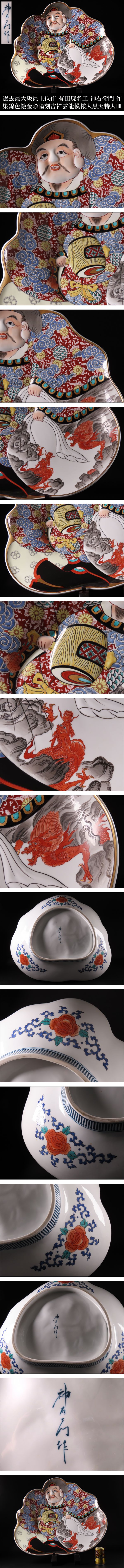 【ONE'S】過去最大級 最上位作 有田焼名工 神右衛門 作 染錦色絵金彩陽刻 吉祥雲龍模様 大黒天形特大皿 飾皿 幅60.5cm 重量9.62kg 古美術品 | |||