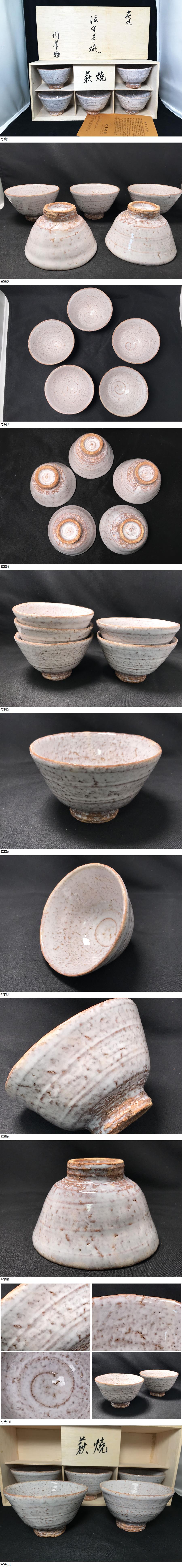 ◆美品 未使用!5客セット 萩焼 梅田陶楽 汲出茶碗 抹茶碗 茶道具 骨董 高さ7cm 直径約11.4cm 重量約184.5g 白鼠 貫入 栞・共箱付き 收藏