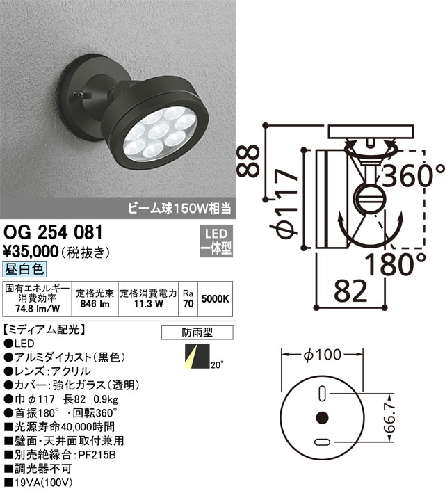 【未使用品】オーデリック エクステリア用LEDスポットライト OG254081 昼白色(5000K) 壁面・天井面取付兼用 ビーム球150W相当 ODELIC 收藏