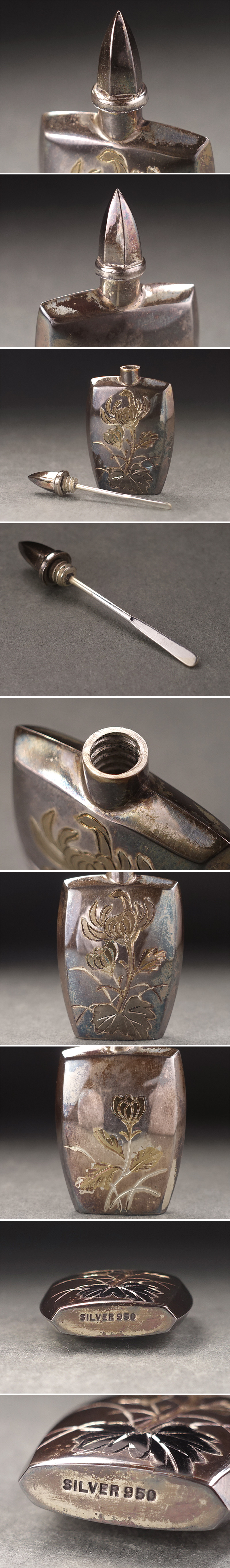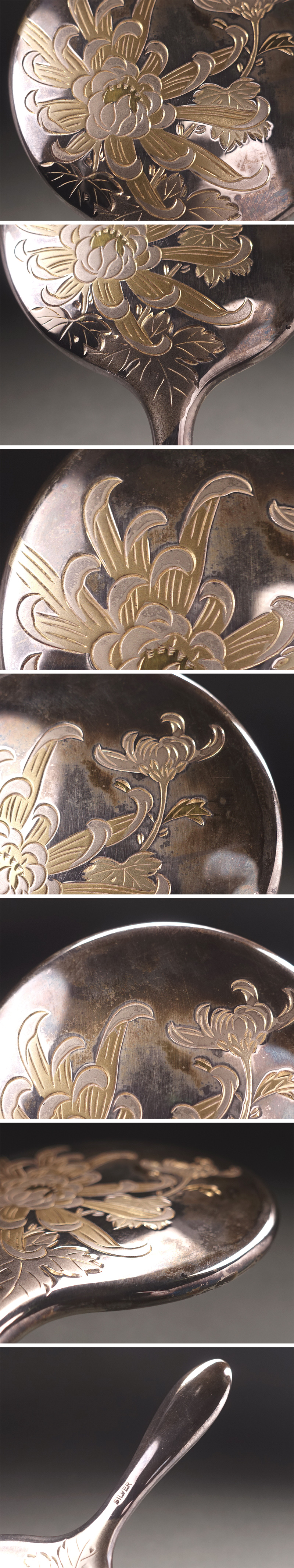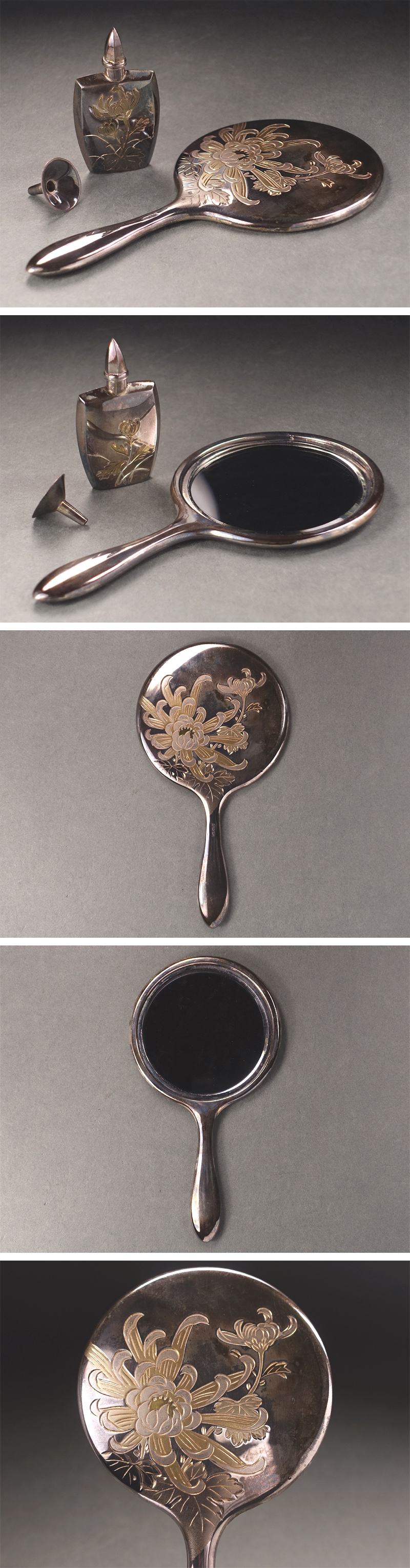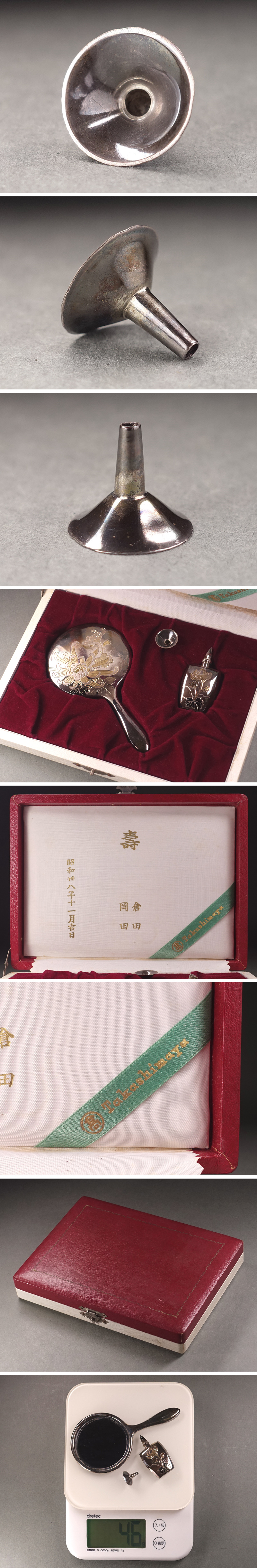 ∇花∇高級銀器 純銀(SV950)片切彫菊花文手鏡・香水瓶・漏斗 SILVER950刻印 合計重量46g 昭和38年高島屋取扱品 收藏
