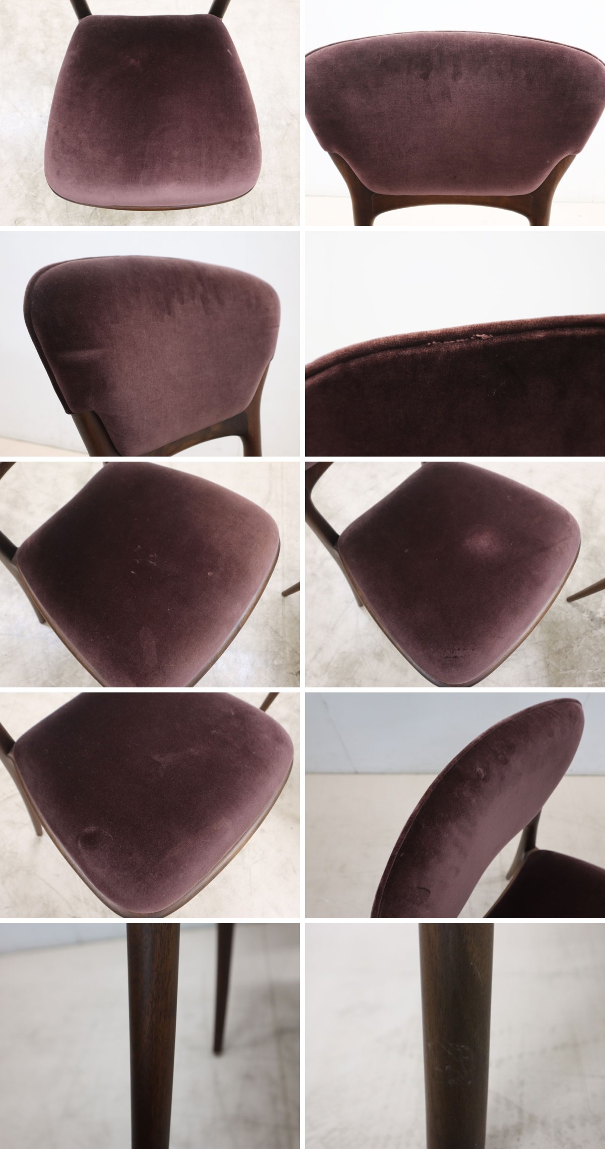 【仕様】 サイズ:約 W51.5×D56×H87.3・SH48cm ※実寸の為、多少の誤差はご了承下さい。 素材:ファブリック、アメリカンウォールナット材 カラー:バーガンディ系(画像は100%正確な色味では御座いませんので気になるお客様は世田谷区船橋の倉庫でご覧頂けます。色味による返品、返金等は一切お受けできませんのでご了承の上でご入札をお願い致します。) 参考価格:3,124,000 円(781,000 円×4) |