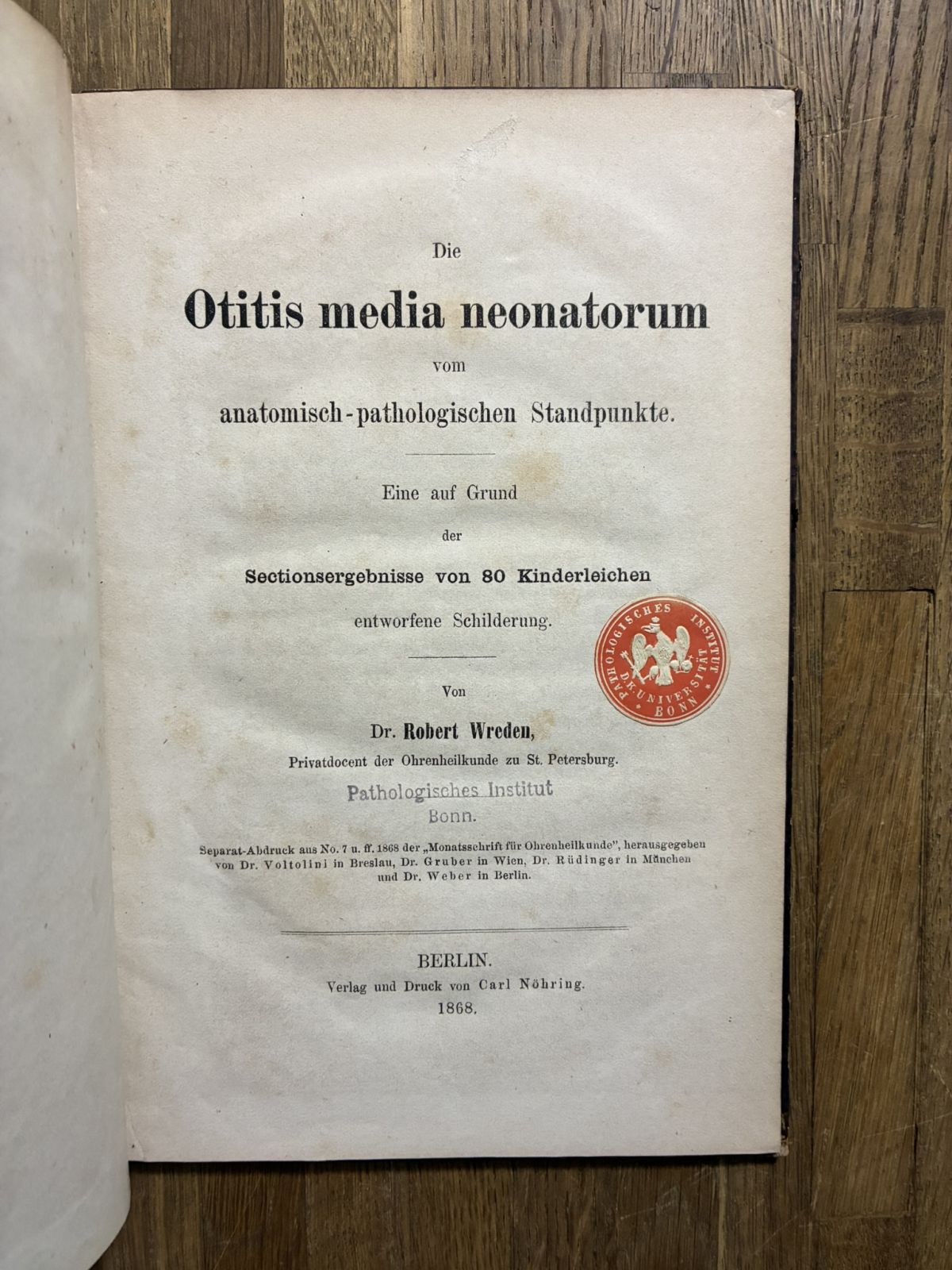 1868年 ローベルト・ヴレーデン 新生児中耳炎 Robert Wreden,Die Otitis media neonatorum vom anatomisch-pathologischen Standpunkte 收藏